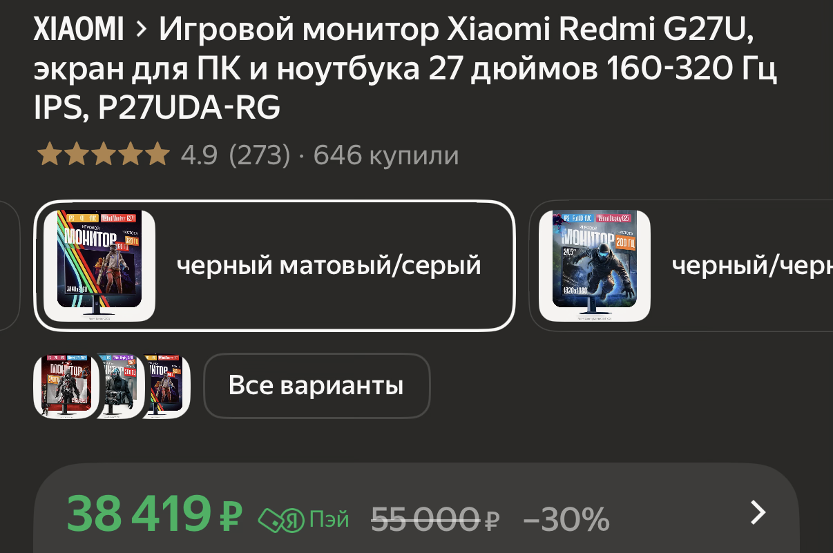 >>7595467 Мне нужно 27" И на руках у меня нет денег сейчас столько, яндекс маркет и кидаю, потому что там сплитом можно на 6 месяцев взять Так бы я пошёл на озоне взял тыщ за 25 моник 27" 4к