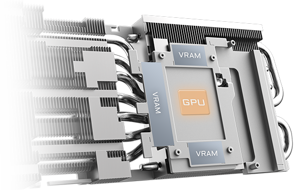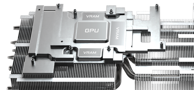 >LARGE COPPER PLATE & COMPOSITE COPPER HEAT PIPE >The large copper plate directly contacts the GPU, coupled with the composite copper heat pipes, which quickly transfers the heat of the GPU and VRAM to the heatsink.
