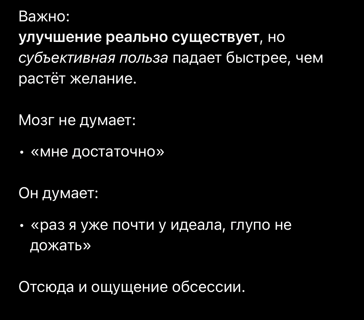 Тут написал >>7599169 Бездумные неконтролируемые импульсы, цели ради цели Думаю, психика так спасается от мысли о бесмысленности существования. Пока вот так вот гонюсь за целями, то мысли о бесмысленности жизни уходят, как только цель достигнута, то никакой радости нет и снова ощущение пустоты и бесмысленности