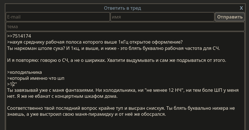 Ой че-то я падежи потерял... Короче, я имел ввиду что основной причиной высокого уровня шума есть низкокачественная мк которая регулирует звук - раз, два - фиксированный большой ку (в основном около 20-40) что ультра дохуя, три - комбинация предыдущих двух: была бы механическая регулировка громкости (или моторизированная как в олдовых ресиверах) то такой хуйни не было бы. Даже на той же обоссаной тпа. Дорогие мк цифровой регулировки громкости имеют шумовую полку конечно же ниже, но все равно отчетливо слышно даже на полезном сигнале