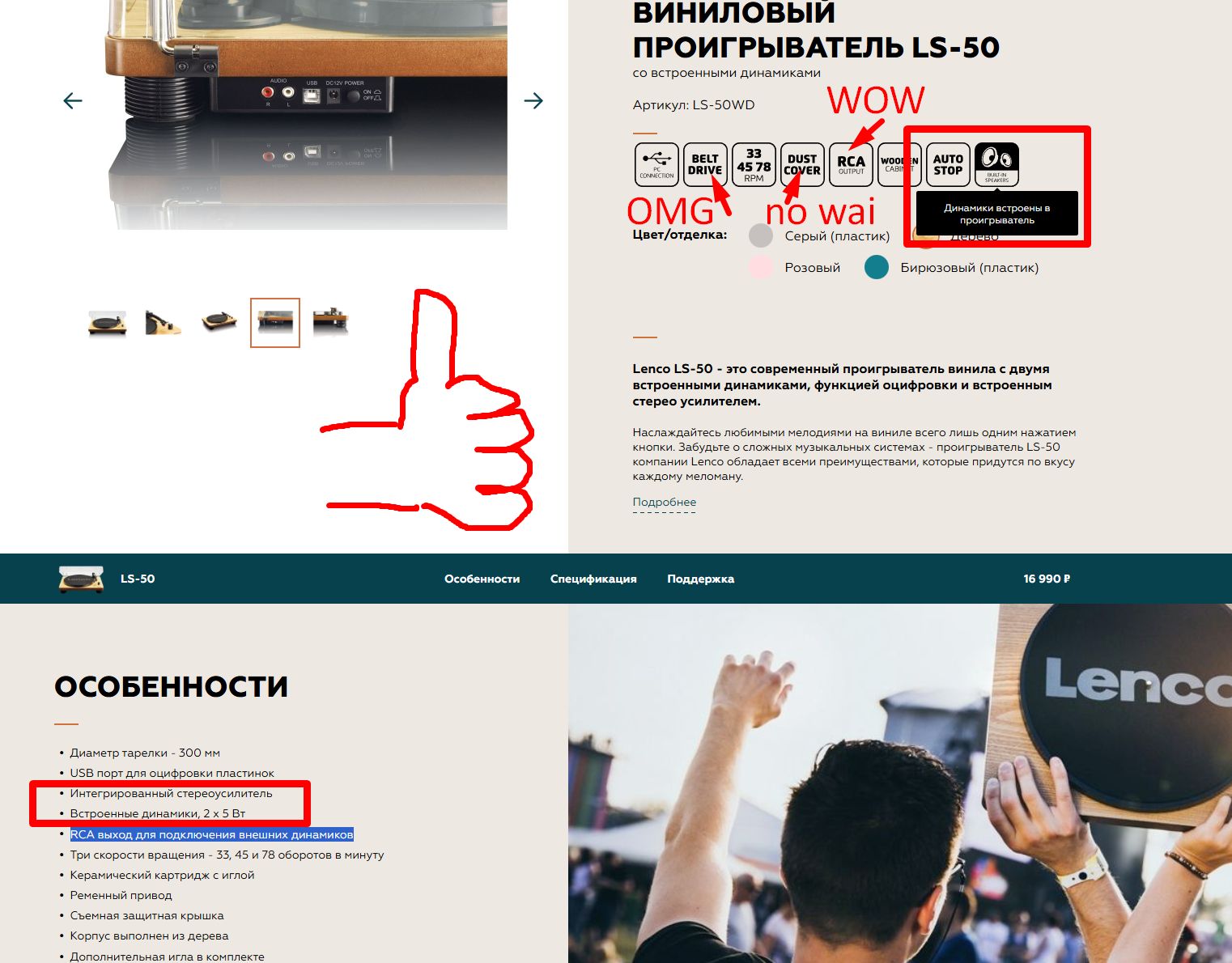 >>7541876 >проигрыватель пикрил https://lenco.ru/catalog/turntables/LS-50WD/ >RCA выход для подключения внешних динамиков У тебя там встроенный неотключаемый фонокорректор, балбес. На колонках не нужен режим PHONO. Надеюсь, ты не угробил встроенный в них (колонки) фонокорр.