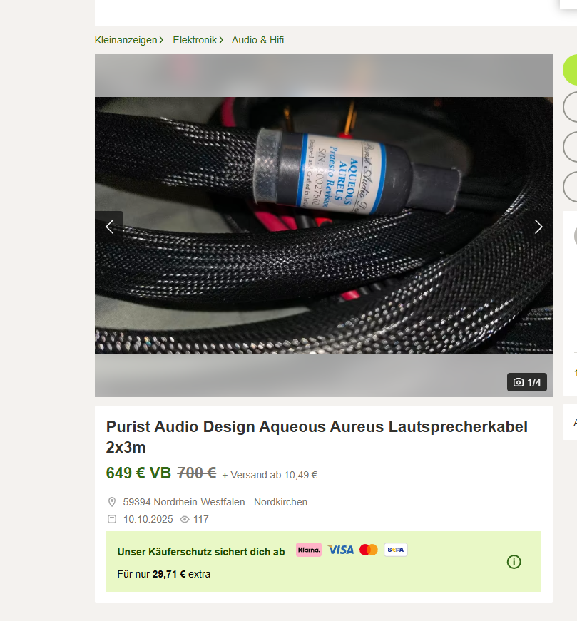 >>7542763 Я вначале загуглил Кардас, от которого у тебя коробка. https://www.hifishark.com/search?q=cardas+cygnus так-то 1000-1500 долларов/евро за 2.5 м пару. Но это не он. У тебя Purist Audio Design https://www.hifishark.com/search?q=purist+audio+aqueous С ценами полный рандом, 3-метровая пара в Германии продается за 650 евро. В почете ли он у удифилов, я уже не помню. Кардас в почете, но не у всех. Подделки некоторых моделей существуют. Но вообще массово подделывают Аудиоквест, Кардас и особенно Нордост, всякую бутиковую хуету не так часто. Можешь попробовать написать производителю https://puristaudiodesign.com/Data/products/speaker/spk_aqu.html и прислать фото, некоторые вполне дружелюбно отвечают. Если оригинал - продавай как немец, за 60-80к.