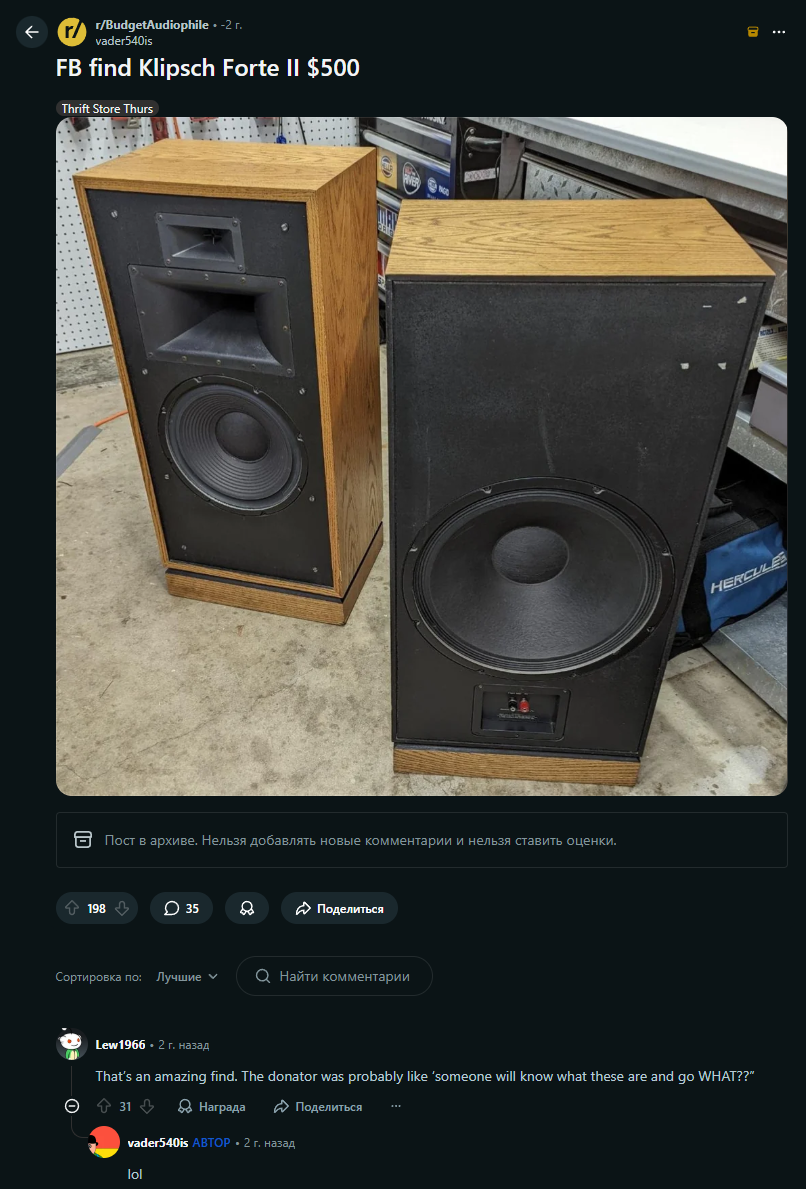 >>7599602 >Ушла эра хифи. А ушла от нищеты народа. Какой бред. Нищие были всегда и везде. Проблема не в том что у нищих нету денег на хифи, а в том что хифи стоит неприличных денег, при чем таких что разрыв между стоимостью условного стерео сетапа с учетом галочки на копирастию выходит дороже чем любая из подребностей нищука даже на перспективу. Неиронично ситуацию могла исправить плановая экономика которая была в совке и совпала как раз с ламповой эпохой. Все крутые ширики из совка стоила буквально рубли, прикинь! Одно только пошло не по плану - несмотря на то что радиол на бумаге слепали миллионы, буквально, и много раз больше динамиков к ним, даже в нынешнее время с огнем не сыскать их по адекватной цене... >>7599893 >. Саб, который просто допёрдывает 30-50 Гц, Так пажжы, разница в глубине между 30-35-40Гц просто колоссальная и даже топовые ас не все умеют играть 30 в полку. При этом учитывая их габариты, помещение автоматом считается большим; глупо пытаться получить 30Гц в типикал комнате человейника и при этом надеяться не беспокоить соседей через три этажа. >играя не ВМЕСТО, а ВМЕСТЕ с АС - хуйня by design. Что за бред? Саб который элф играет ровно как и нч-звено - одновременно вместе с ас, при этом в элф канал не стесняются совать и нч которое должно было идти на фронты. Ты уж определись. >>7599967 >По SVS или хотя бы Клипшaм голяк, раз ты КЕФы смотришь? Цены видел? >Вообще похуй, пока у тебя в обделку комнаты не вложено около ляма и она не выведена на околостудийные стандарты искать разницу между ЗЯ и нормальным ФИ полная шиза, тк у тебя помещение один хуй всё смажет. Звукообработка помещения не столько не стоит в отличии от постройки комнаты с ноля. В остальном сколько ты не суй матов ваты в комнату - если она маленькай то низы неизбежно будут просачиваться к соседям. >>7599953 >>KEF Kube 1 >Анекдотическая хуйня, играющая от 50 Гц. Впрочем, даже он может помочь R3 Нет не сможет. У ПИ на слух более крутой спад на нч. Его кефы и так играют 50гц.
