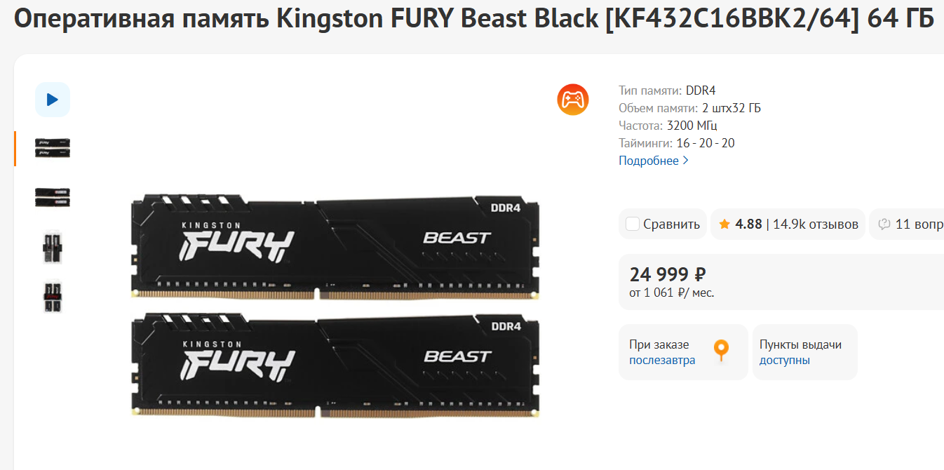 https://www.compday.ru/komplektuyuszie/moduli-pamyati/317919.htm опаньки, я полмесяца назад за 6кк рублей купил или типа того. Вот это шиза моё постение. Вовремя как доставить планку на 16 Gb GDDR4 купил, так как летом на дачу в тот комп память увёз доставить туда... Опаньки, вот это да заговор производителей. Видимо снимают чипы памяти DDR4 с производства Samsung и Micron... Переходите на DDR5, всем придётся силой насильно обновляться. Я на основном компе на Core Ultra 7 265k очень холодном и 4 планками DDR 5 игровыми от Patriot Viper Gaming Xtreme 5 24 Gb итого 96 Гб операвтивы. Играть в игры на UE5, например в TFD стало получше, чем на DDR 4, фризы и лаги ушли... https://www.compday.ru/komplektuyuszie/moduli-pamyati/317919.htm