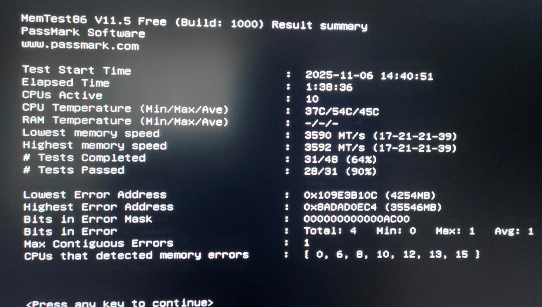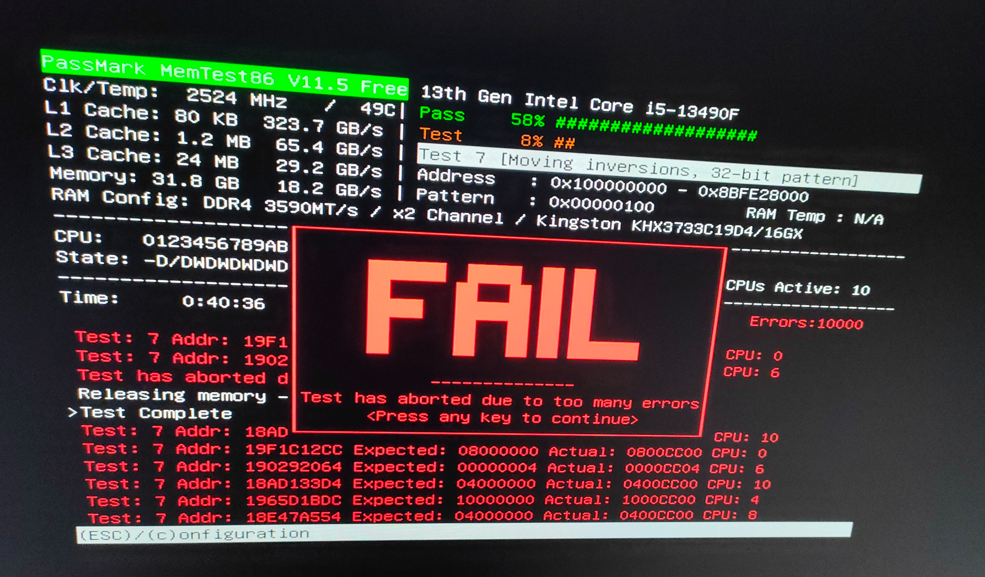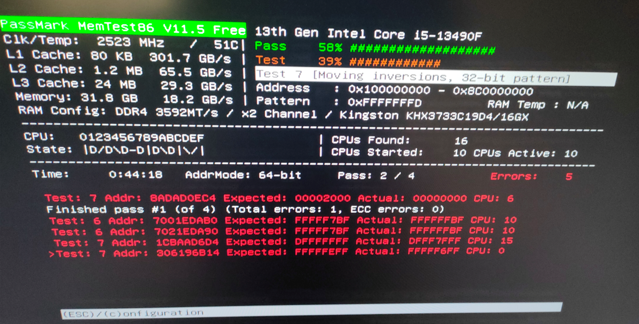 >>6975353 вощим скачал мемтест, начал тестировать, она уже на втором тесте насобирали 10000 ошибок и тесты остановились спирта нет, в другие контакты вставлял планки - там вообще тест завис почти в начале