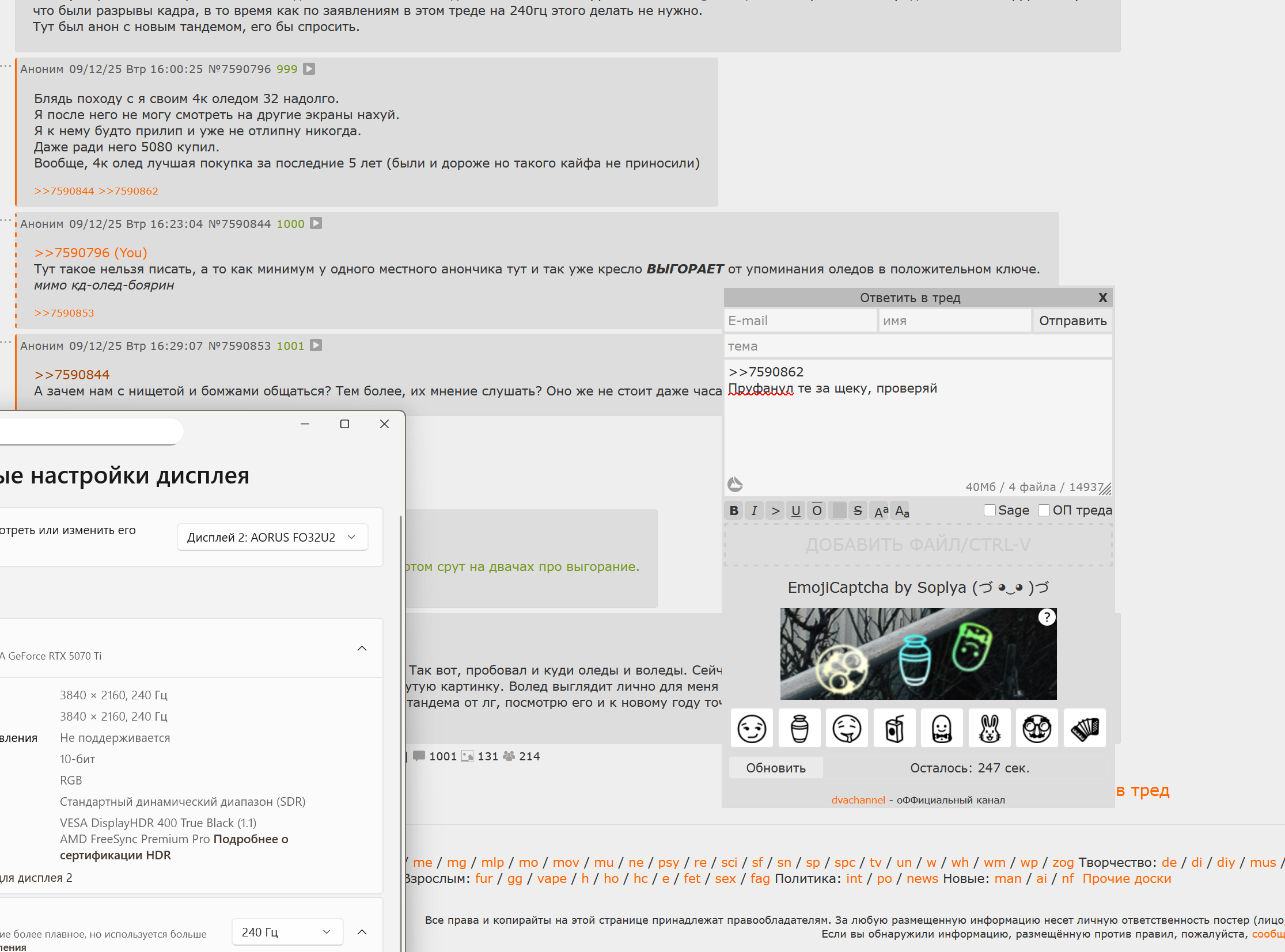 >>7585747 >минус это врр фликер Вырубай нахуй любой врр и в мониторе, и в драйвере. Антифликеринг тоже выключаешь. И балдеешь. Нет никаких разрывов. Я тестил и онлайн дрочильни с 300+ фпс, и синглы в 60-200 фпс. Ноль разрывов. VRR на оледах это тупо гиммик для продажи монитора школьникам геймерам, которые привыкли к тому что жи-синк = хорошо. Туда же отправляется hdr, бестолковая хуйня для игр и капчевания в 99% случаев. В фильмах не тестил.