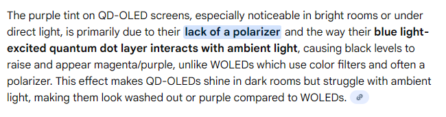 >>7587242 Да этот шезлонг регулярно такое вкидывает, и ещё активно срёт про фиолетовые кд-олеги, у меня самого S95c 55" и фиолетового в использовании обычном не видно, так же второй популярный тейк у этого шиза про низкую яркость и необходимость использовать олег в полной темноте.