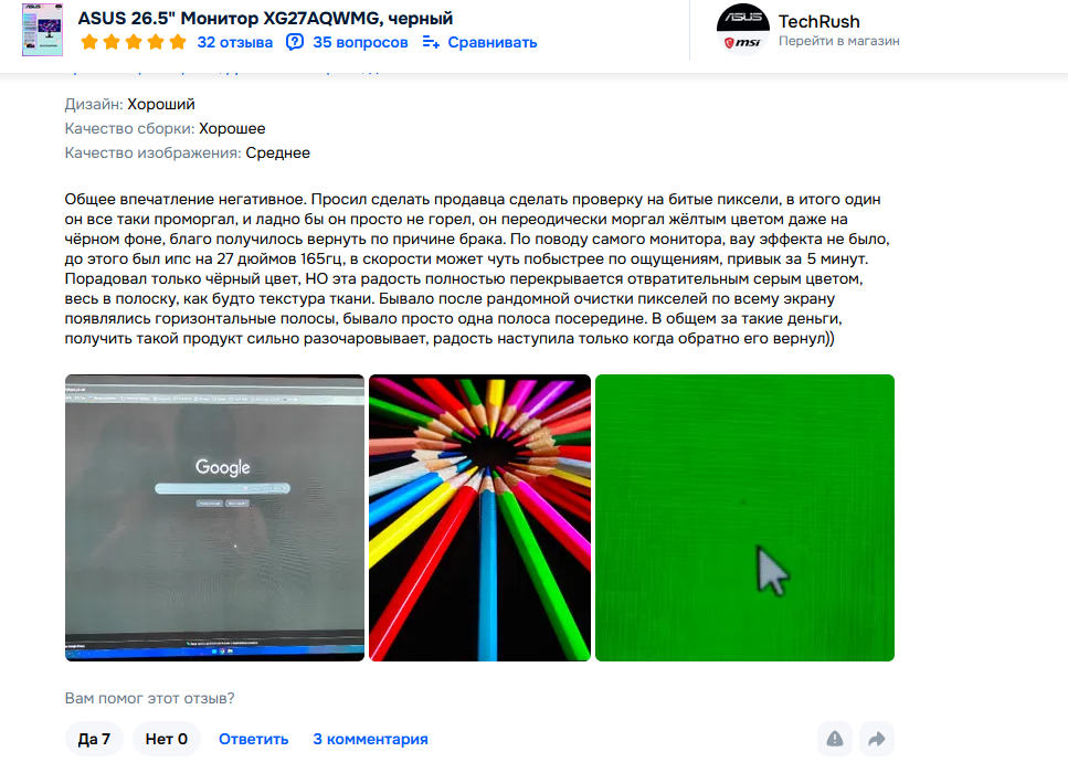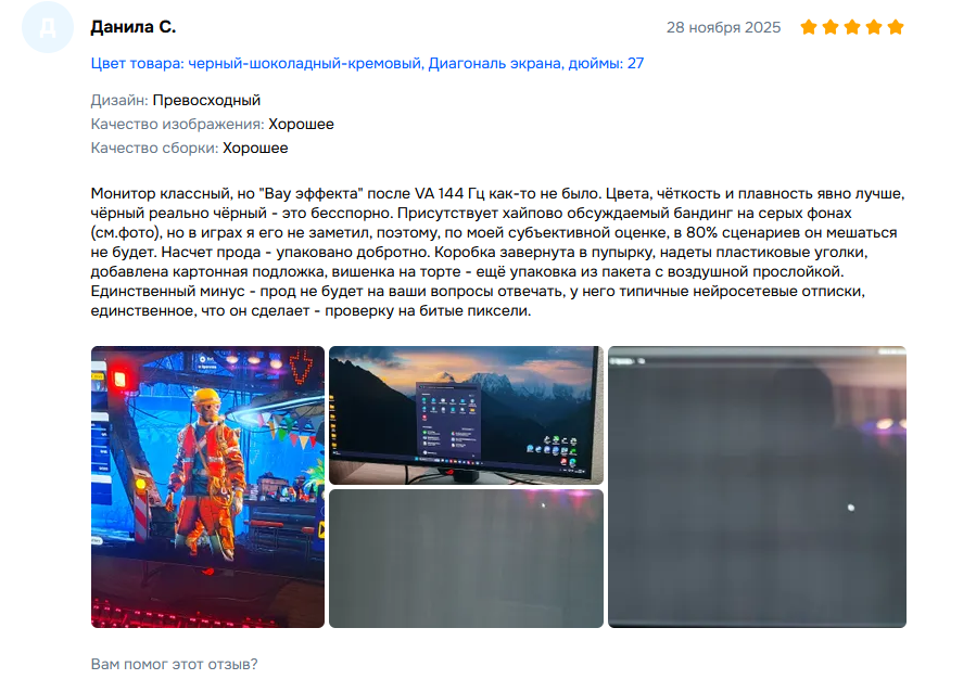>>7586716 Смотря как использовать. Если тебе нужна инфа по панелям, установленным в безымянном китайском кале - полезно. Если тебе нужен гайдлайн по покупке манятора - оценки автора очень субъективны и не опираются на реальный опыт с оцениваемым манитрами.