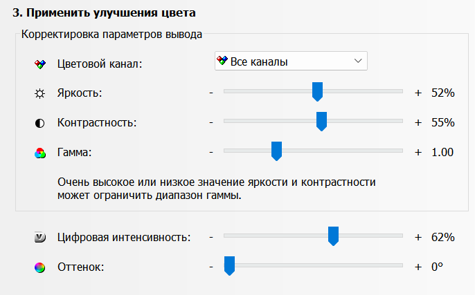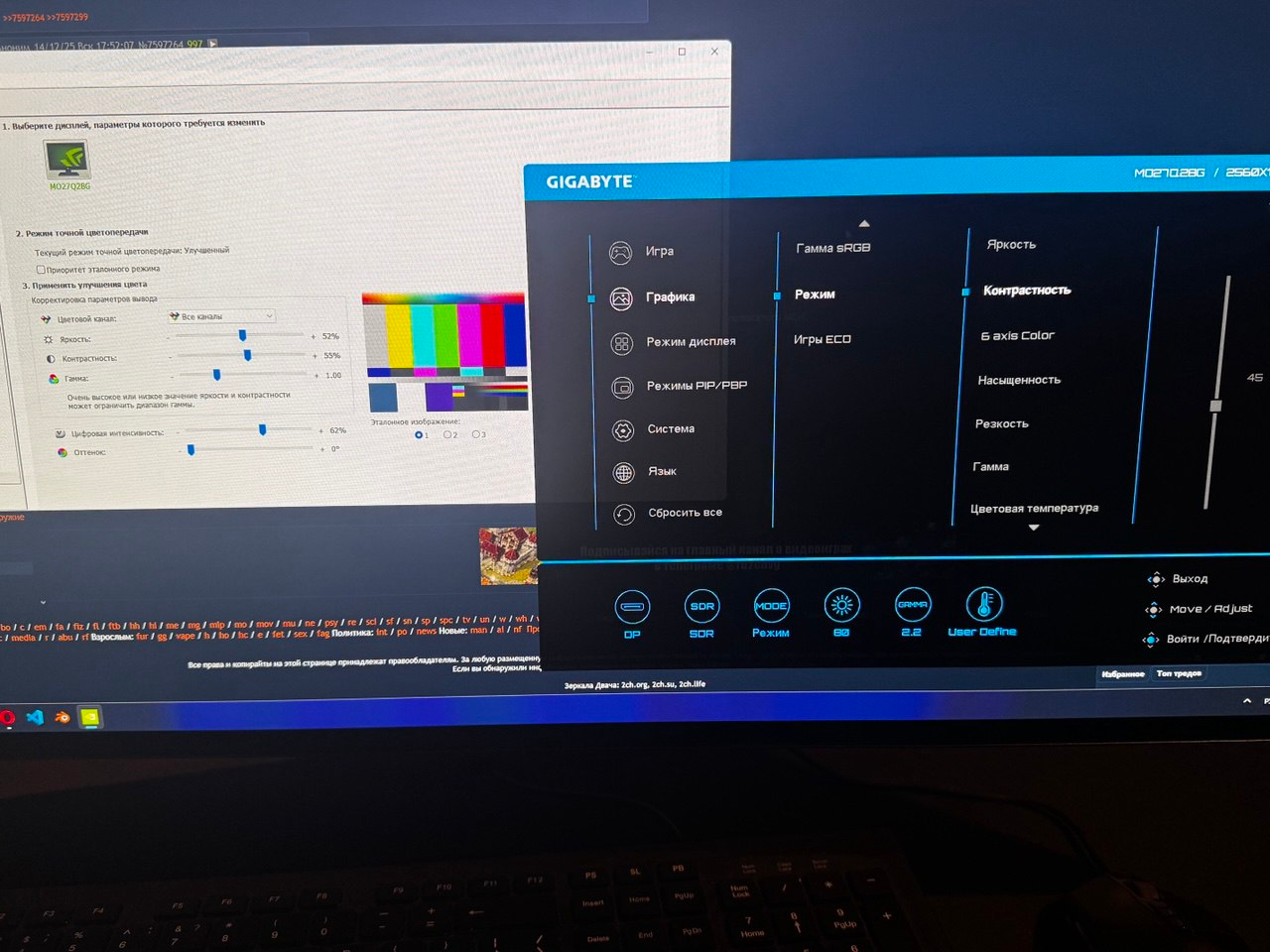 >>7597337 1 выставляешь такие настройки нвидия как на картинке 1>>7592269 2 заходишь в калибровку цветов виндоус, что бытуда попасть пишешь в пуске цветов 3 на экране пике 2 тебе нужно очень точно выставить цвета что бы синий был синий желтый желтым 4 заходишь в нвидию выставляешь на пике 1 цвет синий и понижаешь гамму что бы убрать синеву 5 заходишь снова в калибровку цветов виндоус и прогоняешь еще раз пик 2 сравниваешь с прошлым результатом Настройки монитора насыщеннсоть 100, контрастность монитора добавляет синевы при убавлении кнтарста и убирает синеву при добавлении то есть тебе надо натсраивать все это на выбраном контрасте и яркости 6 натсраиваешь оттенок нвидия ты можешь его натсроить на пункте 3 там натсраиваются жеотые розовые бюирюзовые цвета я сейчас сижу на оттенке 0 но с другим пресетом монитора, другие пресеты монитора тоже оттенок меняют их можешь менять тоже на пункте 3