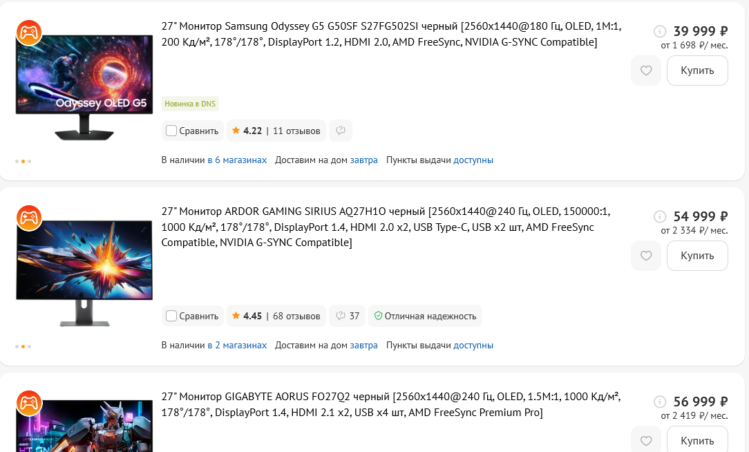 Купил Samsung Odyssey OLED G6 за 90, он подешевел до 60.В целом вау эффекта не ощутил пока тестировал.Чёрный цвет круто конечно, но он очень сильно желтит.Вроде пишут что их отлично КАЛибруют на заводе, но какая-то хуйня.Может, прошить его надо.Но пока нет времени, поом займусь.Если у кого-то под рукой есть инфа как его прошивать под рукой, или настройки, скиньте, я пока не гуглил даже. Но основной вопрос у меня на другую тему, нужен моник до 35к который будет использоваться в винде и некоторых играх, чтобы ОЛЕД не выгорал.27", нужно, чтобы он выдавал достойную картинку, без сильных недостатков, и чтобы стоил своих денег.Главное - чтобы не было целофановой пелены на изображении.Чтобы у него был хороший синий цвет.У меня сейчас старый монитор LG, с какими то делениями на пластике по краям экрана, видимо профессиональный, там была эта пелена, но потом я полез в настройки, поставил какую-то галочку, P-чето там, вроде такая только на профессиональных мониках есть, расширенное отображение цветов, и пелена ушла сразу.Но потом там появилась вертикальная белая полоса кривая справа, я дурак горячий чай сдвинул под угол моника.Вот желательно чтоб в новом монике такая же была.Посмотреть не могу сейчас, на работе.Покупать буду только в ДНС.Маркетплейсы нахуй, уже наебали меня там на проц.