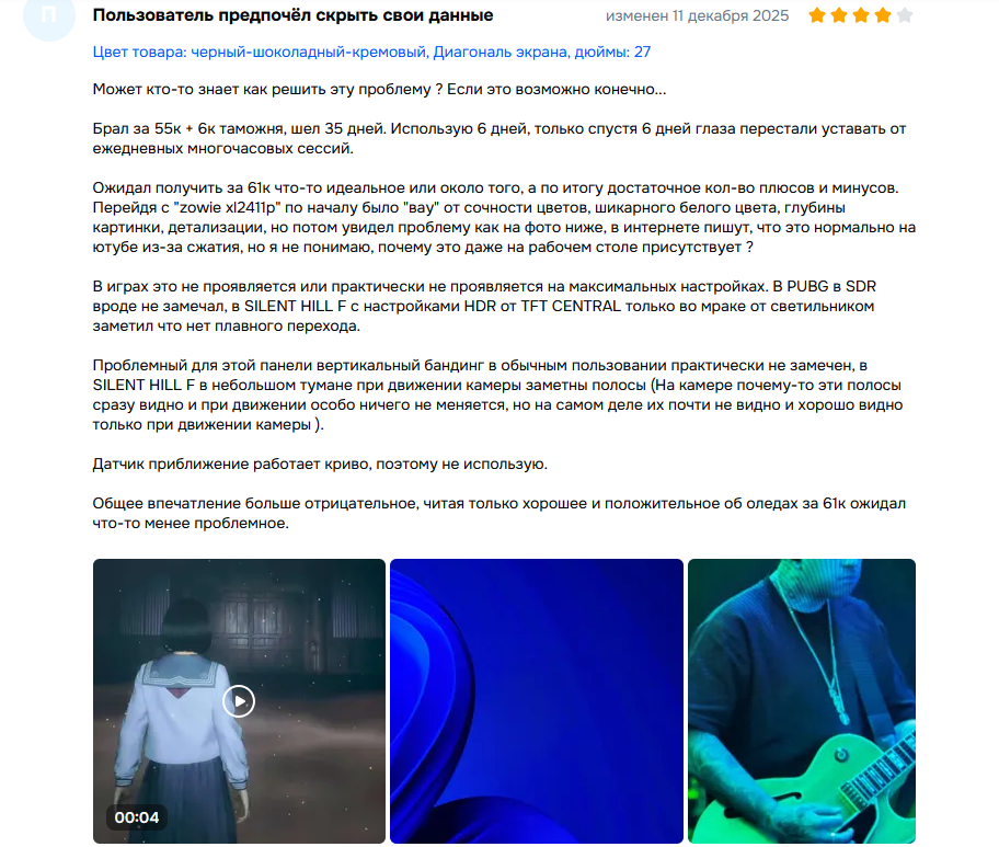 >>7590881 В общем - потестил тандем. Да, прикольно, но 2к не хочется, а ждать следующий год ради 4к тандема тоже не вариант. Купил сегодня 32gs95uv-b. Когда тестил его в магазине, все было очень хорошо, дома заметил бандинг на сером цвете. Но суть в том, что этот бандинг не такой УЖАСНЫЙ, как его описывают местные шизы. Вижу его только если прямо всматриваться. Меня это никаким образом не напрягает, т.к. взял монитор не что-бы двачи скроллить, а для поглощения калтента, с чем монитор справляется на 10/10. Впервые я прочувствовал, что такое HDR в играх. Мой TCL 34R83Q на миниледе - не выдает такой HDR, хотя протыки говорили, что будет как на оледе. В целом - покупкой доволен. 2 года гарантии в том числе на выгорание. Так что сижу, балдею, если выгорит, обменяю или сдам назад. Пока полет нормальный. Перед покупкой именно своего монитора, вскрыл два таких же и нашел в них битые пиксели. Хз на сколько массовая проблема, но в моем магазине было так