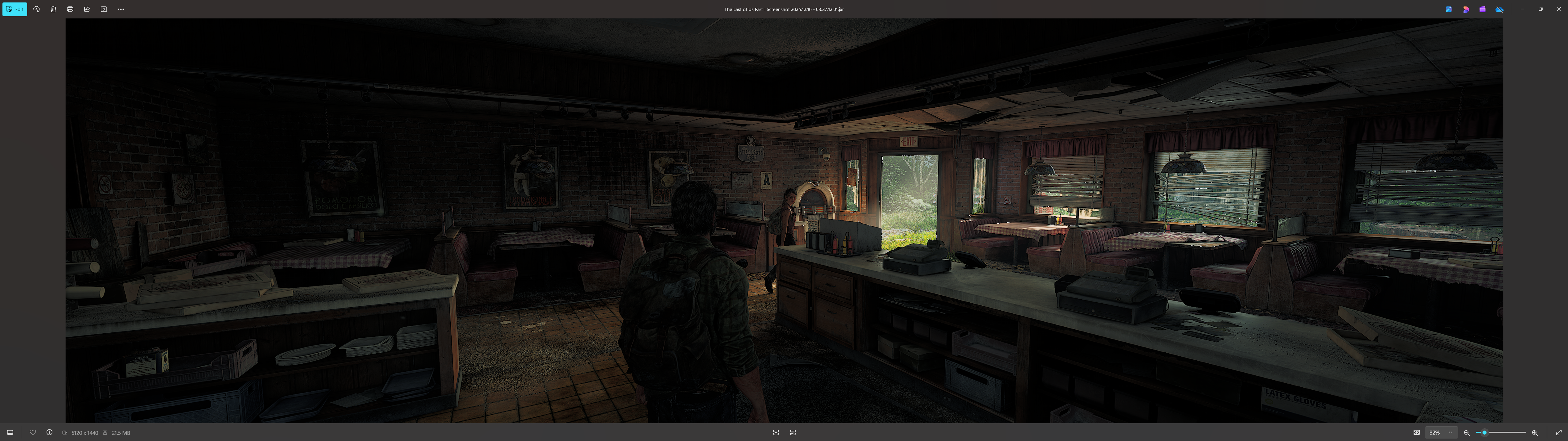 Ещё раз в ахуе просто со своего нового монитора, который в стандартном режиме жрёт все тени в черноту. Кружка и надписи слева просто нет, если не выставить бледный sRGB или специально вручную понавыкрученный пресет. Надо было в png скриншот делать, жипег тоже жрёт детали в тенях, их там охуеть было в игре.
