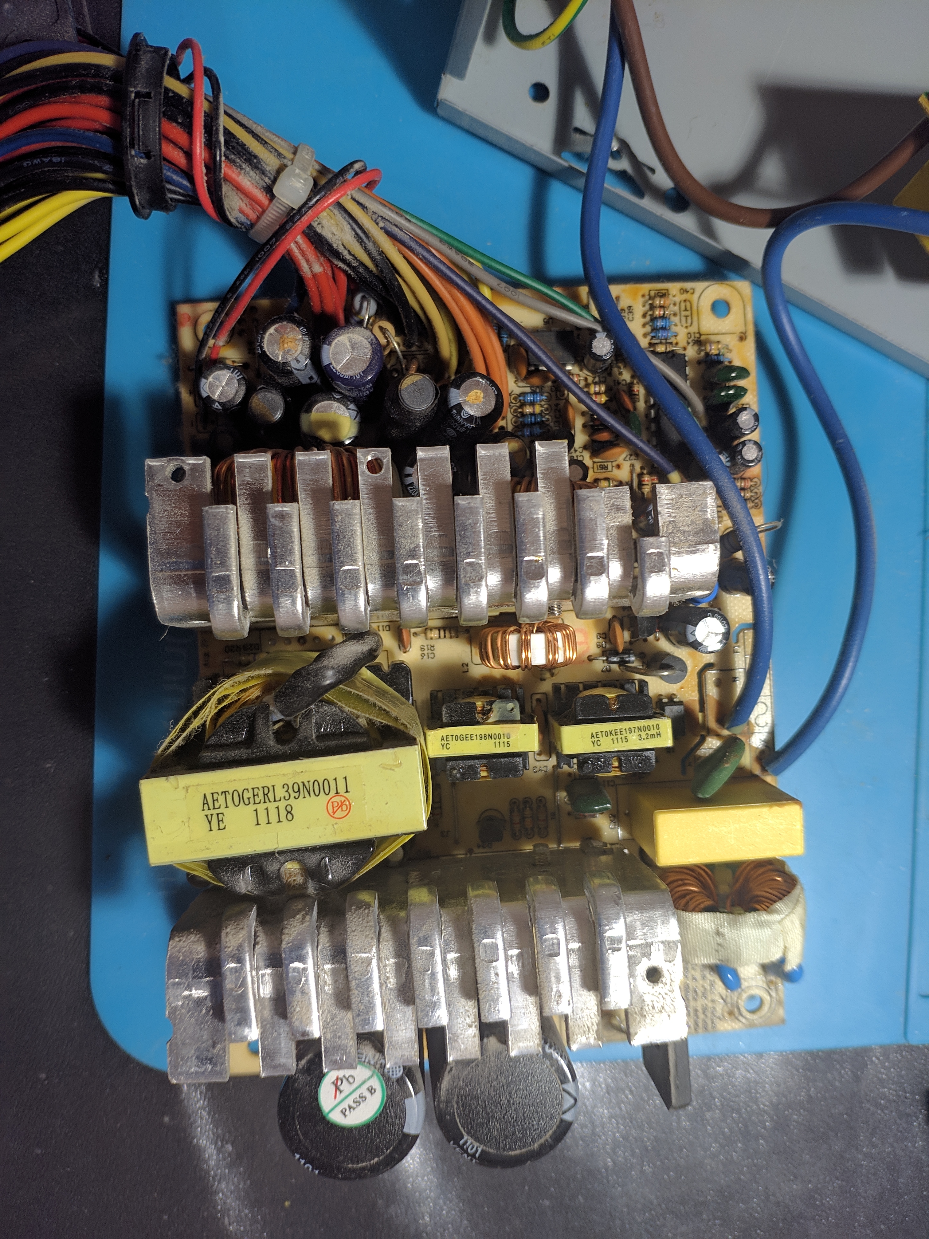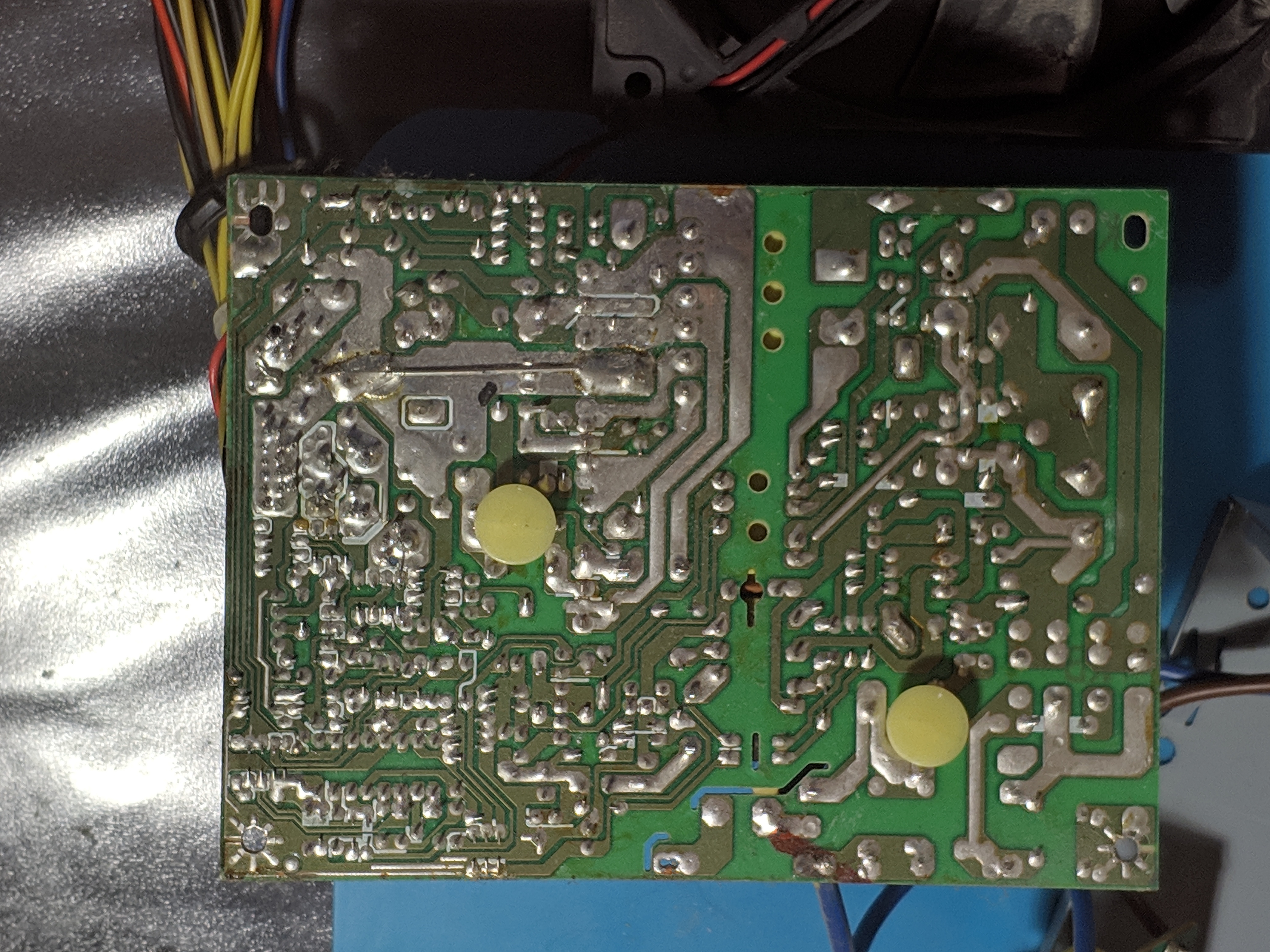 Ёбнул блок питания LW6-500W. Использовался в качестве источника напряжений для макетной платы, т.е. без нагрузки. Подрисуйте стрелочками, где и что проверить. Симптомы были следующие: