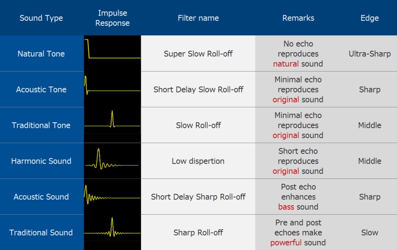 Здесь довольно хорошо описан принцип работы. Если вкратце, современные цапы апсемплят аудиосигнал, который на них подаётся до своей нативной частоты, то есть условно, мы слушаем обычный сидюк 44.1кгц, а частота дискретизации самого цапа 384кгц, поэтому появившиеся промежутки между семплами исходного аудиосигнала заполняются некоторыми усредненным значениями. Алгоритм фильтрации и определяет, каким образом будет дорисовываться звуковая волна, но обычно впоследствии этого появляются артефакты ringing, которые выглядят как небольшие волны перед и после звукового импульса (обычно он не слышен на слух). Так вот подбор фильтра - это выбор некоторого компромисса между точностью импульса и срезом высоких частот. Sharp roll-off - это четкий срез ВЧ на ~20кгц, но довольно заменый рингинг, slow roll-off это плавный спад ВЧ, начиная где-то с 15кгц, из-за чего, к 20кгц уже заметна просадка, но более точная передача импульсов. В прочем, большинство особой разницы между фильтрами не слышит, я юзаю slow только потому что у меня наушники сами по себе имеют сильный подъём на крае ВЧ. А, ну и ещё есть всякие minimum phase варианты, в статье про них написано