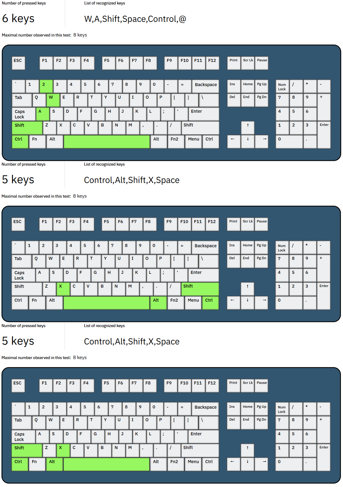 >>7355890 > У меня такая клава поддерживает три нажатия точно > Дизайнер решил сэкономить на матрице и половина комбинаций из трёх кнопок просто не работают