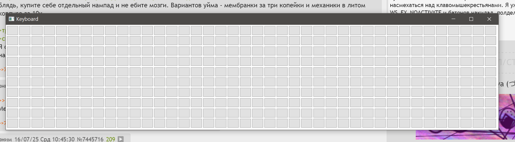 >>7445662 Ну вот я >>7444611 купил 75ку на днях, а руку все равно носить плечо песочит. Заказываю щас планшет, буду дрочить дикпик чтобы написал мне оск с граблей корованов. Чтобы пеном вводить точечно нужные мне символы и макросы без всякого ктрл-шифтования, откинувшись в кресле руководителя бюрократ, и насмехаться над клавомышекрестьянами. Я уже окно создал с WS_EX_NOACTIVATE и батонов накидал, полдела считай сделано.