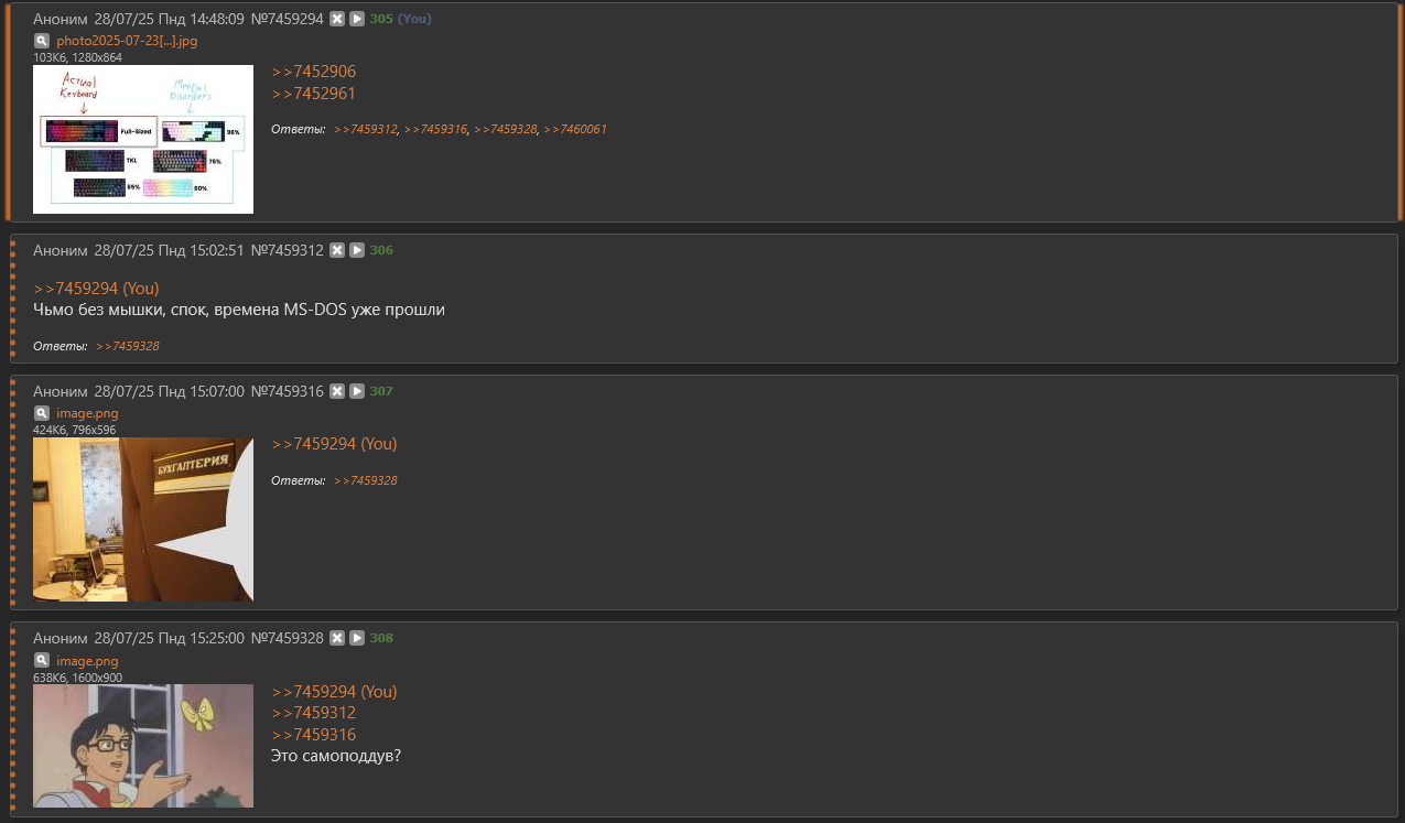 >>7450108 Ради интереса как-то измерил скорость печати на клавиатуре Леново (высокие клавиши), логитеке с укороченным ходом клавиш, ножничной а4теч, ноуте синкпад ну и дешевой механике с синими свичами. И... на всех клавиатурах получилась одинаковая скорость и точность 97%. Но на высоких клавиатурах у меня со временем начинают болеть запястья, поэтому сейчас остановился на ножницах. А визуально и тактильно больше всего нравится Леново, прямо ощущается, будто что-то важное печатешь.