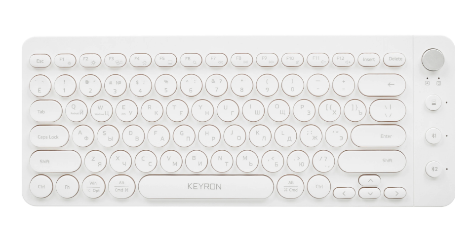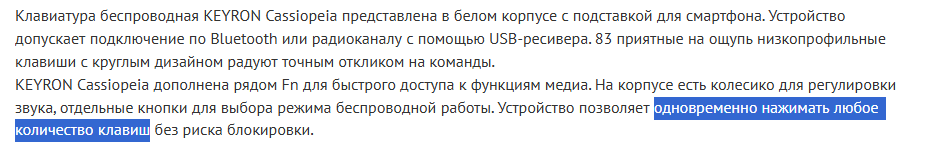 Cassiopeia Клавиатура из днонс за 1300 рублев в форм-факторе без нумпада, то есть 75%, но с крутилкой. Фирма Keyron. Начнем, пожалуй, с плюсов: Тихая шопиздец. Действительно тихая прям, могу сравнить ее с ножницами в ноутбуках, а тише уже и почти некуда будто. Особый метариал какой-то у пластика будто или проложено что-то мягкое, так чтобы кепки не бились громко об корпус или другие элементы. Сам ход кнопок оооочень большой, как для низкопрофильной мембранной клавиатуры, так еще и тихой. Ощущения нажатия явно есть. Пробел, функциональные клавиши и f-ряд имеют выпуклую форму. Остальное, соответственно, имеет ВПУКЛУЮ форму. Но все они окружности, само собой. Удобны ли круглые кепки? Ну, они не раздражают, но и смысла делать их круглыми я не вижу, кроме как эстетика. А эстетика тут просто потрясающая! Даже название клавиатуры уже располагает к вапорвейву, как и ее белоснежный цвет, как и ее округлые формы. Однозначно одна из самых красивых клавиатур, которых я видел. Скорость набора не изменилась на ней у меня, может даже немного повысилась точность. Раскладка не бесит, она более-менее стандартная. Можно быстро переключаться между тремя устройствами (как на моей mx master 2.5s) Есть выемка под планшет, ручку там или тонкий смартфон без чехла. Как на Mitsumi, только побольше. Минусы: Существование клавиши fn слева я для себя рационализировать не сумел В днонс указано пикрил, а по факту не работают сочетания с ctrl + shift + любая другая нахуй клавиша. Просто пиздец. О такой хуйне как бы предупреждать нужно заранее. Я вообще впервые вижу такое на мембранках нахуй. Окей, я могу понять почему на моей k280e не нажимается 28 кнопок, как на sidewinder x4, но, сука, свои 6 стабильных клавиш она отрабатывает же. Причем правые дубли этих кнопок отрабатывают сочетания без проблем, так что ну проблема не критическая, но значимая и для многих может быть диалбрейкером. Крутилка звука рассчитана на два пальца и это как бы ОК, пойдет, но учитывайте, что она прям тугая. Нет подсветки и ножек, но она уже как бы приподнята достаточно (а я всегда пользуюсь клавами с разложенными ножками).