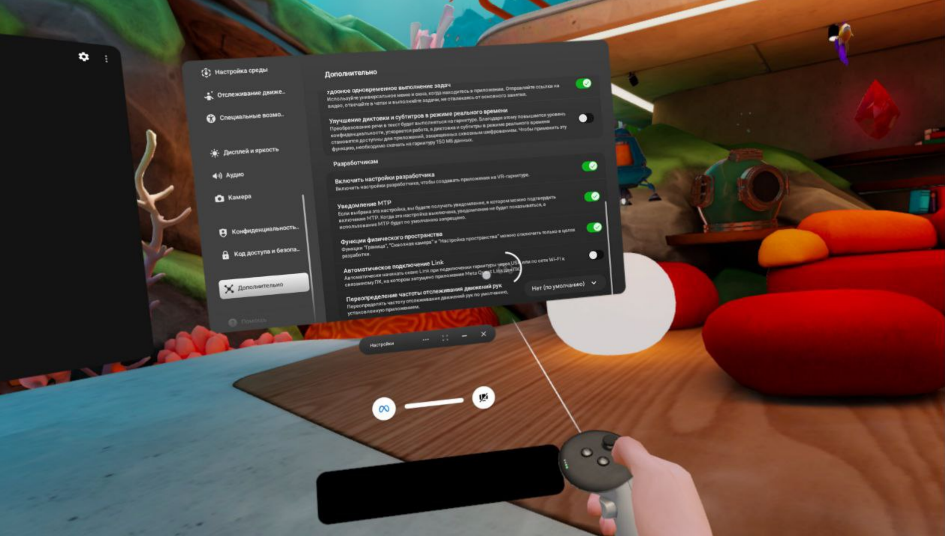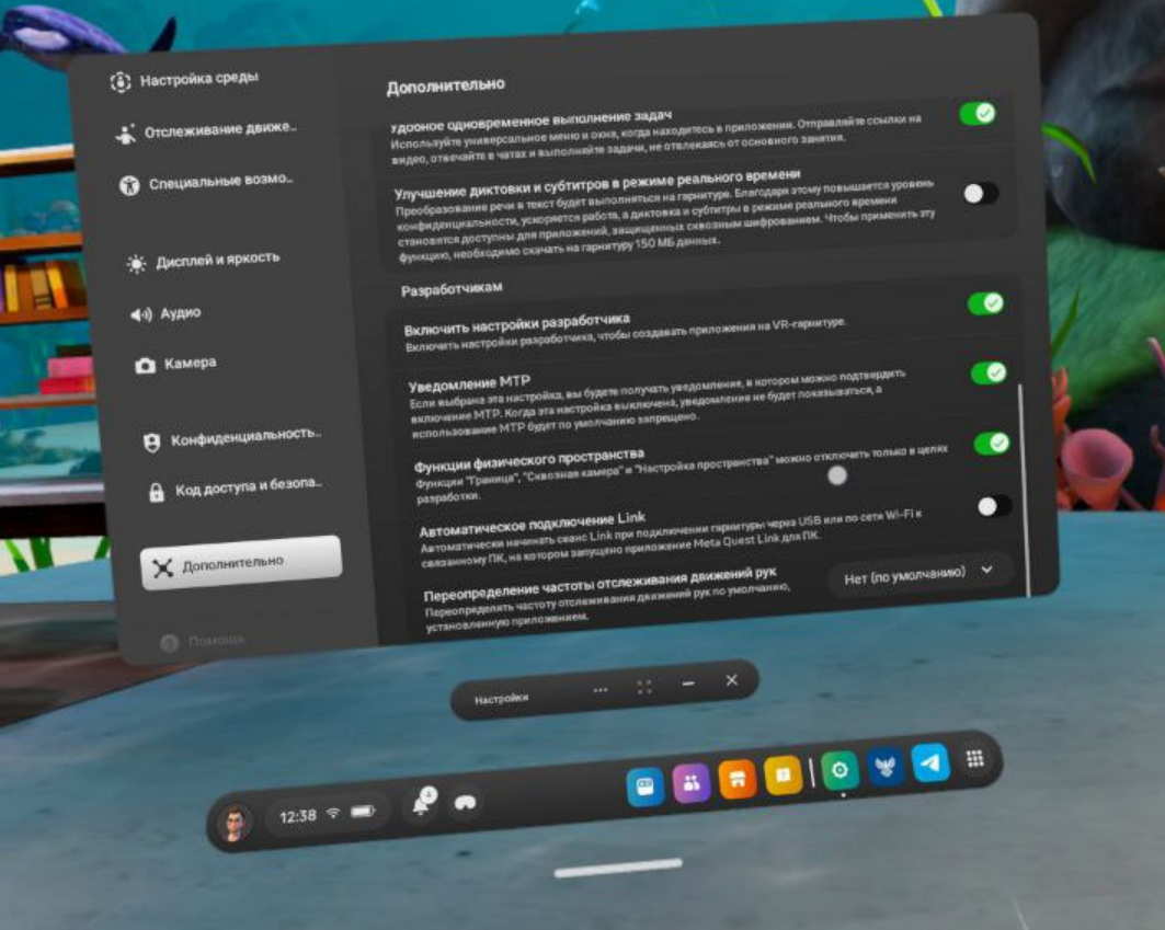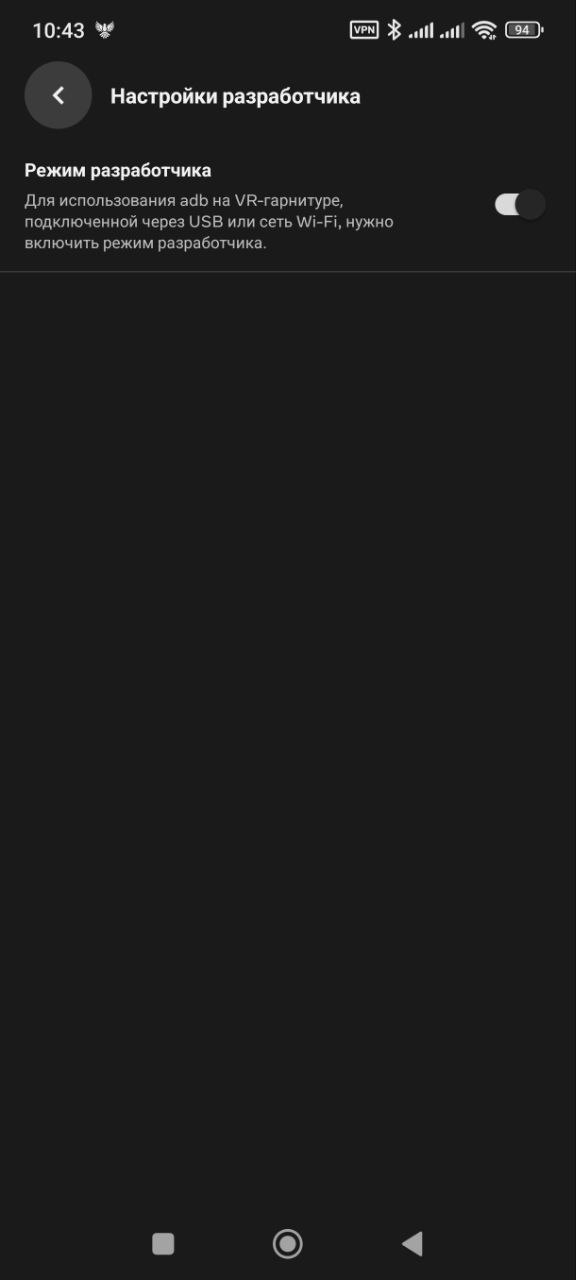 >>7435462 Да нафиг тебе этот сайд квест. Теперь в телефоне галочку поставь в настройках гарнитуры. Скачай на комп кью лоадер https://t.me/VRGamesRUS/16558/814260 И качай что хочешь. Режим разраба на шлеме вроде так выглядит как на пике, но точно не знаю. Я его включил с активацией шлема год назад. Даже не знаю как шлем без режима разраба выглядит.