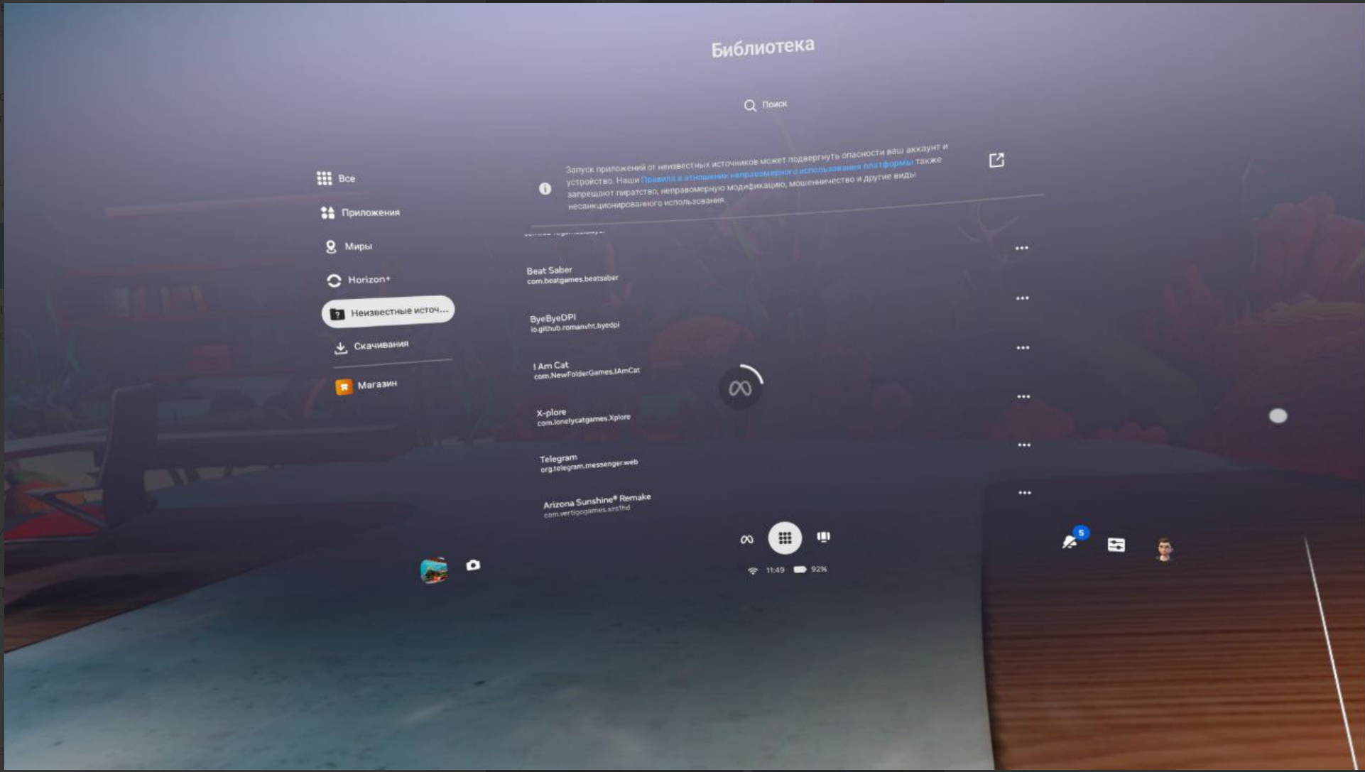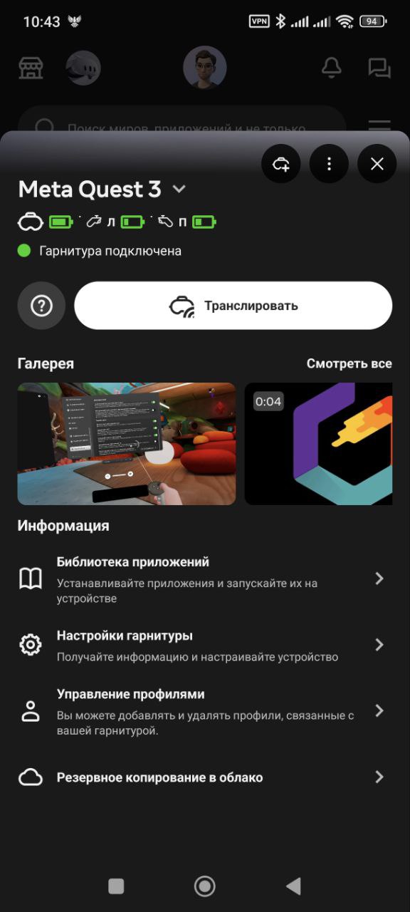 >>7438681 На шлем бай бай дипиай накати или любой другой ВПН прям на шлем. Приложение официальное, из магазина меты. Должно просраться и закачатся. >>7438707 Упадет в библиотеку шлема официальную. Скрин делать на шлеме - зажимаешь кнопку мета на правом контроллере и один раз щелкаешь на том же контроллере курок. Видос - точно так же, но зажимаешь.