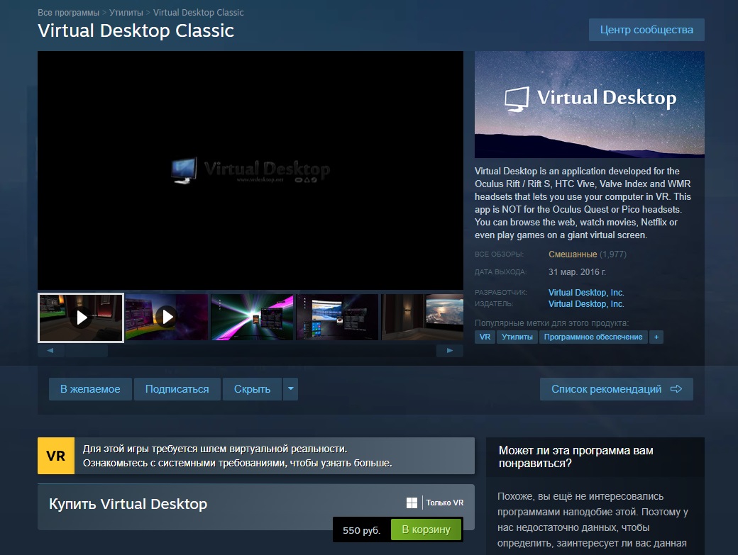 Осло, если в стим вр без ничего у меня запустился Резидент 8 с вр модом, то в виртал десктопе она вообще не грузится.