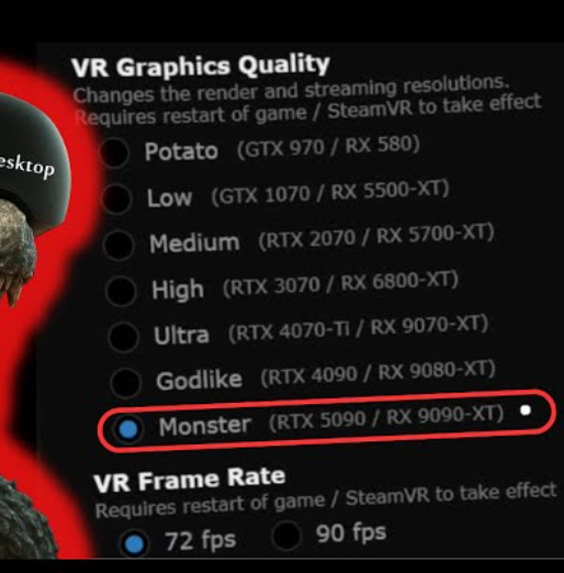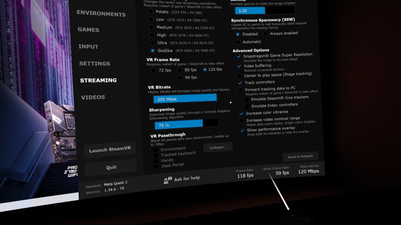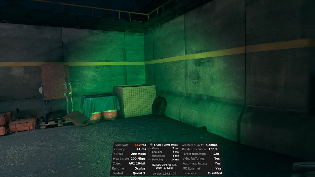 >>7407270 У меня на 4090 работала приемлемо. Пришлось конечно с привычных 120 фпс перейти на 80. Ну и в некоторых сценках включать ASW, то есть играть по сути в 40 фпс. Но хоть стабильно работает.