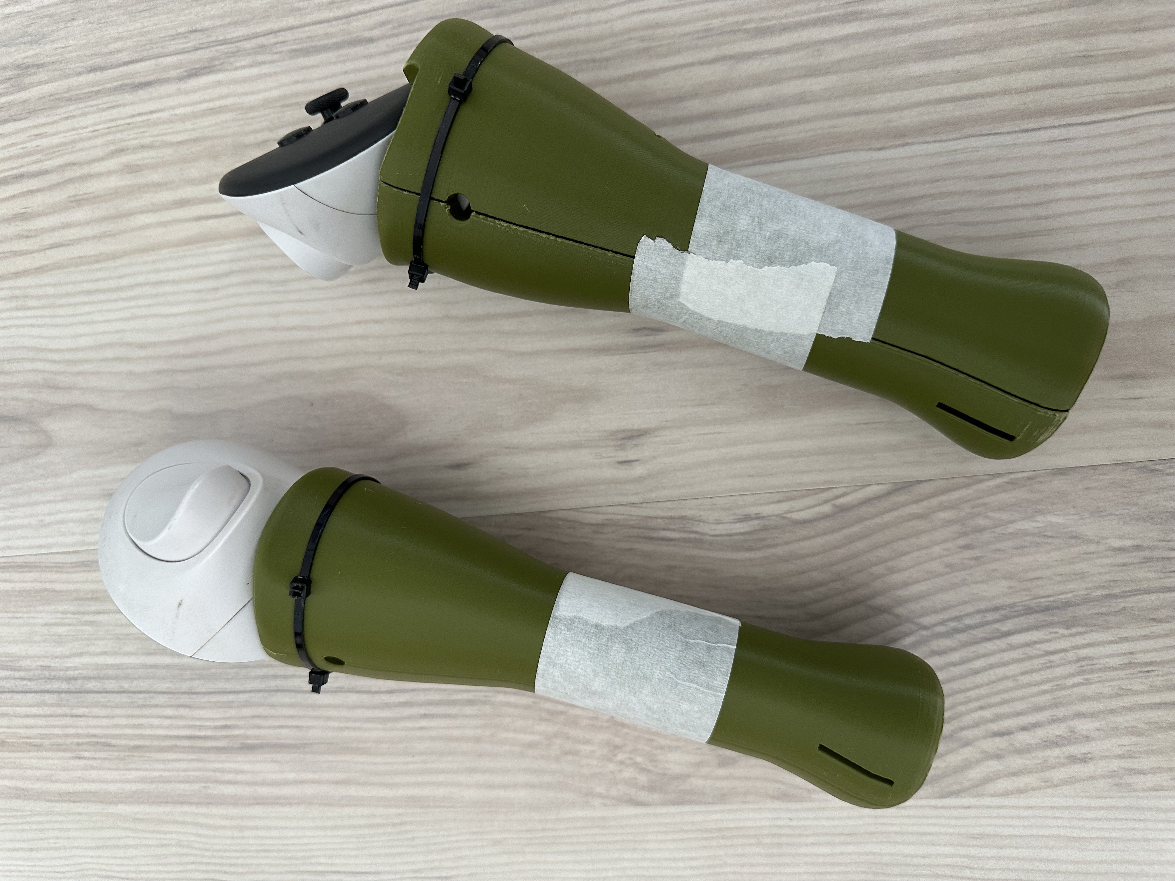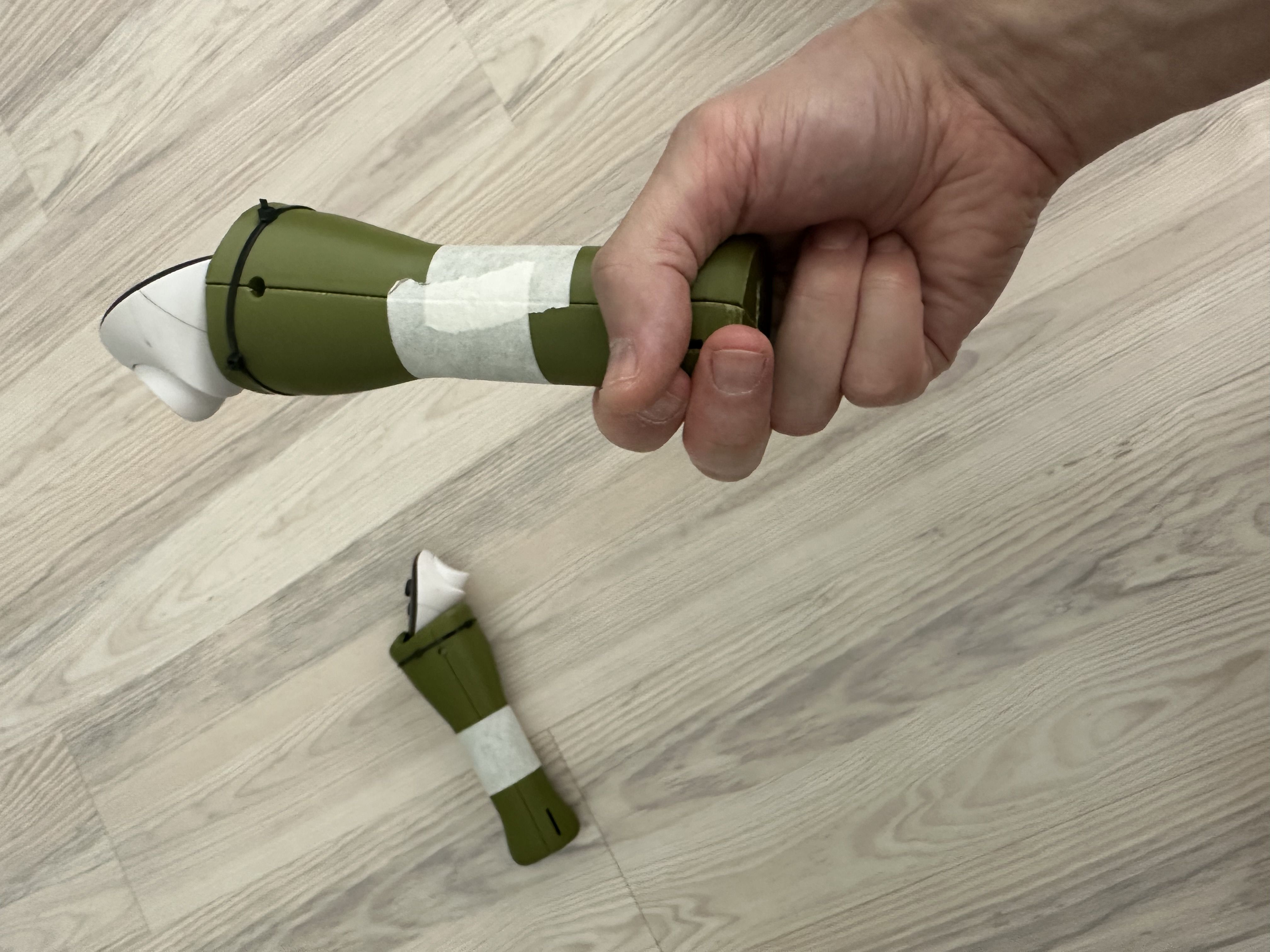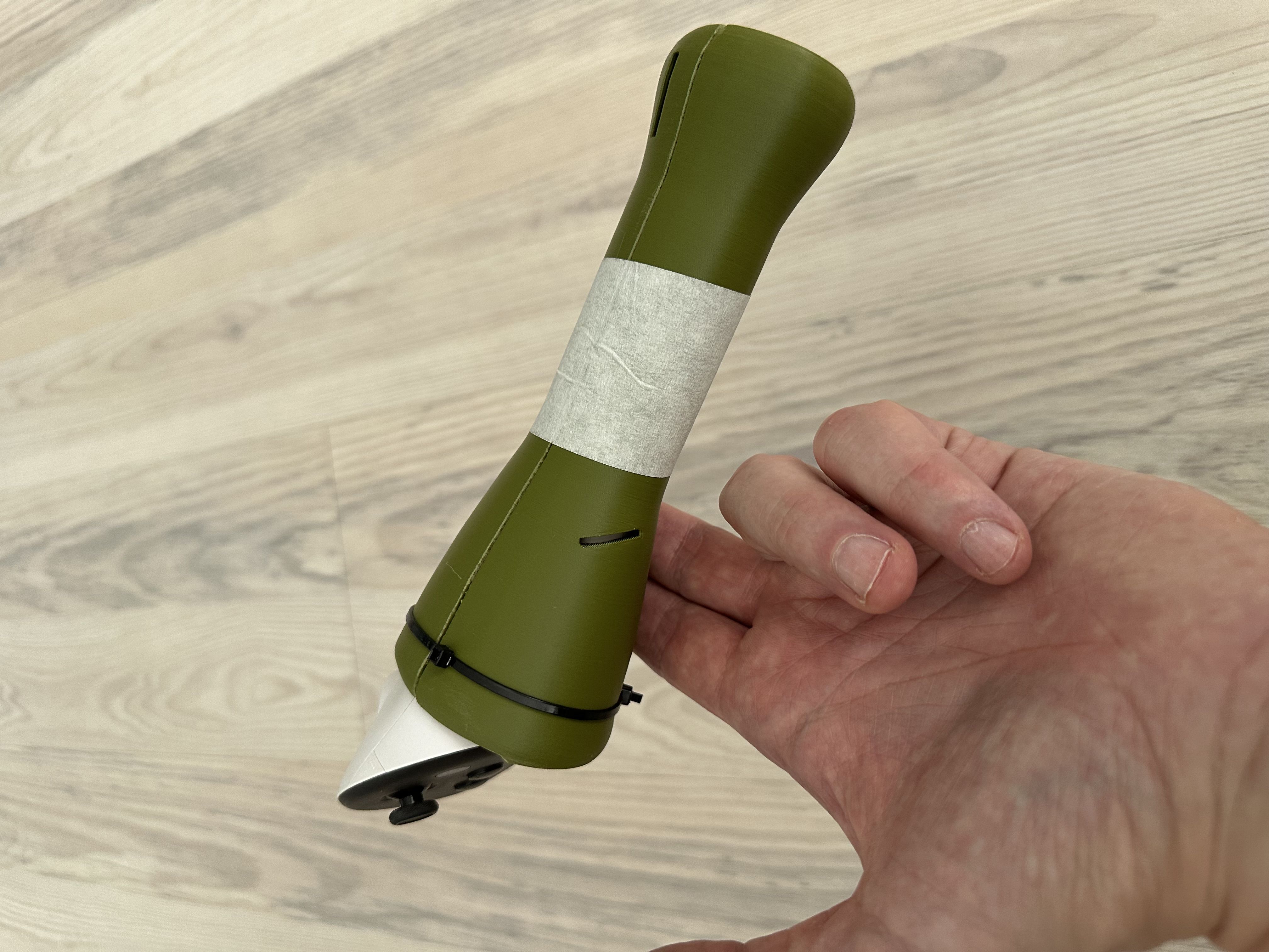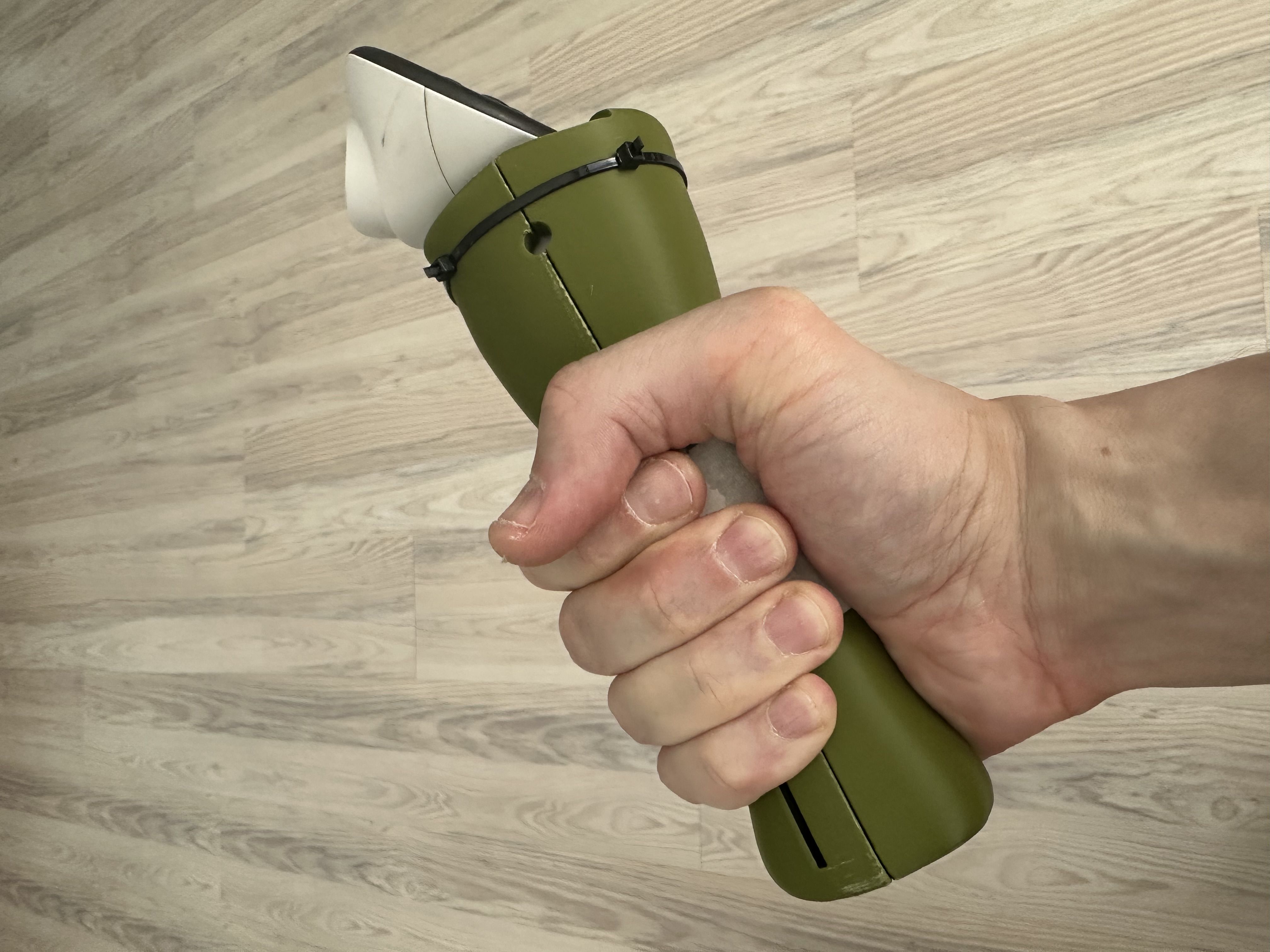 3. рукоятки. Текущие норм по обхвату и общей геометрии (расширяются вверх и вниз), но почти идеально круглые в центре, потому меч при игре расслабленной кистью проворачивается. С идеально откалиброванной геометрией это не проблема, проблема в том, что при развороте светодиоды на контроллере оказываются повёрнутыми в пол, а не к камерам шлема, и трэкинг идёт по пизде. Должен быть нормальный грип, который лежит в руке, не скользит, не проворачивается.