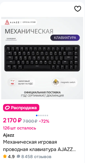 >>7418597 А хуле тут думать? Иди до 3к найти мне 80% с черными свичами. Вот и весь разговор. А всё что выше по ценнику, я посмотрел, уж лучше сразу свой кастом собирать, чем переплачивать за авторское видение, и то зачастую хуевое.