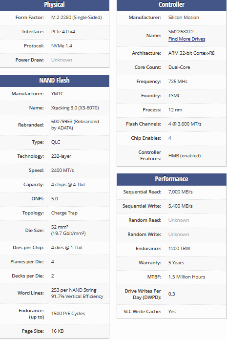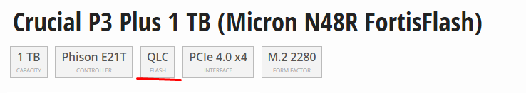 Годнота: • Corsair MP600 Pro (не путать с MP600 Core), GigaByte Aorus Gen4 7000s, MSI Spatium M480 (PCI-E 4.0, Micron TLC 96L, DRAM, контроллер PS5018-E18) • Crucial P5 Plus/Micron 3400 (PCI-E 4.0, Micron TLC 176L, DRAM, контроллер DM02A1) • Samsung 970 Evo Plus (Samsung TLC 96L, DRAM, крнтроллер Elpis) • Samsung PM981a (Samsung TLC, DRAM, контроллер Elpis; OEM вариант 970EVO Plus, Migration tool и Magician его не поддерживает) • HP EX920/EX950 (TLC, DRAM, контроллер SM2262/SM2262EN) • Transcend MTE220S (TLC, DRAM, контроллер SM2262EN) • SK hynix Gold P31 (SK hynix TLC 128L, DRAM, контроллер Cepheus; имея 4-канальный контроллер, сопоставим по проиводительности с хорошими TLC SSD с 8-канальными контроллерами из-за высокой скорости интерфейса самой NAND памяти) • Plextor M9P Plus (M9PeG+/M9PeGN+/M9PeY+) (Kioxia TLC, DRAM, контроллер Marvell 88SS1092, очень высокая скорость работы с мелкими файлами, SLC-кэш в 1/3 свободного места) • Kingston KC2500 (Kioxia TLC, DRAM, контроллер SM2262EN) • ADATA XPG SX8200 Pro/Gammix S11 Pro (не путать с SX8200 Lite) (Micron/Intel 64/96L или Samsung 64L или SK hynix 96L TLC, DRAM, контроллер SM2262EN или SM2262; в последних партиях есть рандом комплектующих с ухудшением характеристик против начальной версии) • Netac N950E Pro (TLC, DRAM, контроллер SM2262/SM2262EN) • AGI AI218 (Intel TLC, DRAM, контроллер SM2262/SM2262EN) • Corsair MP600, Gigabyte Aorus NVMe Gen4, Smartbuy Impact E16, Patriot Viper VP4100, ADATA XPG GAMMIX S50, Seagate FireCuda 520, Goodram Irdm Ultimate X (PCI-E 4.0, TLC Kioxia, DRAM, контроллер PS5016-E16; близнецы с равными характеристиками) • WD Black SN770 (PCI-E 4.0, SanDisk 112L 512-Гбит TLC, HMB, контроллер SanDisk 20-82-01081-A1)