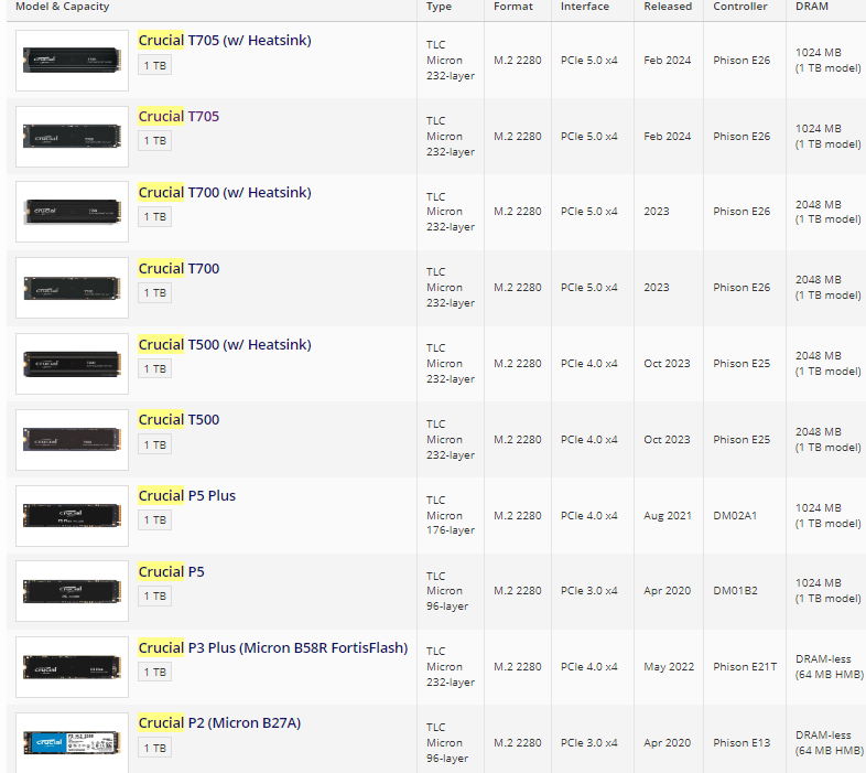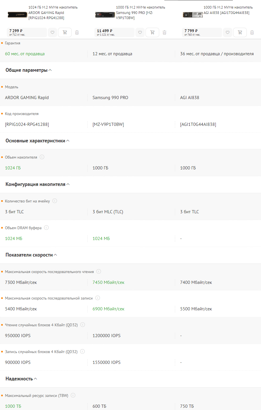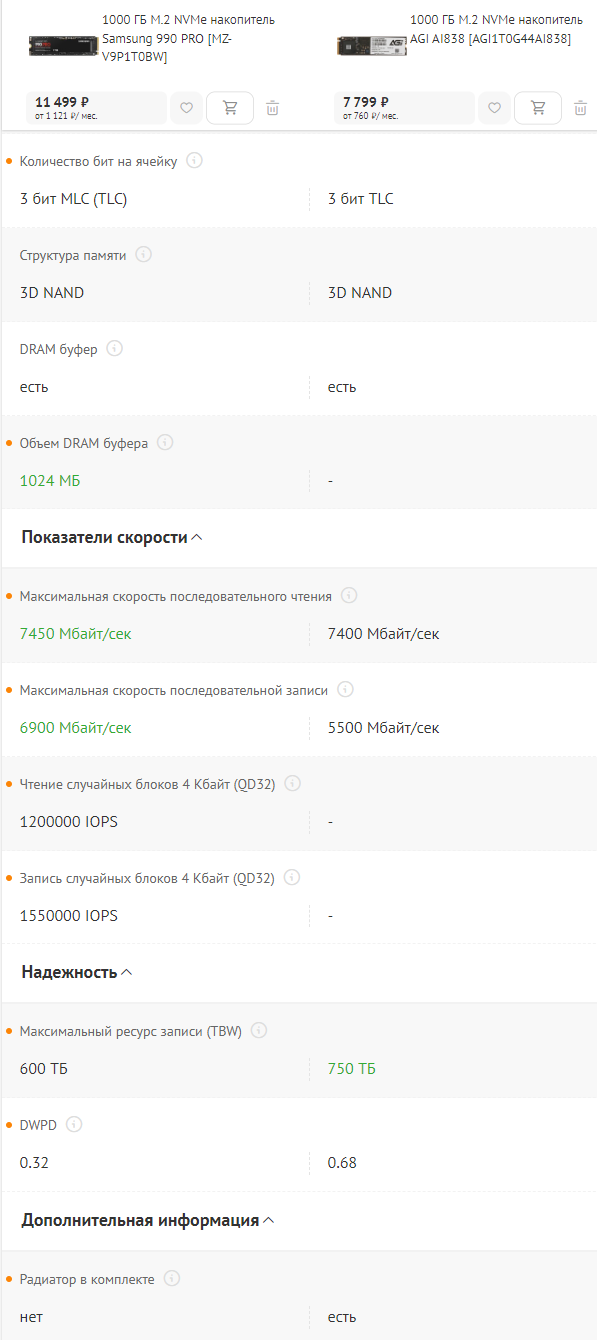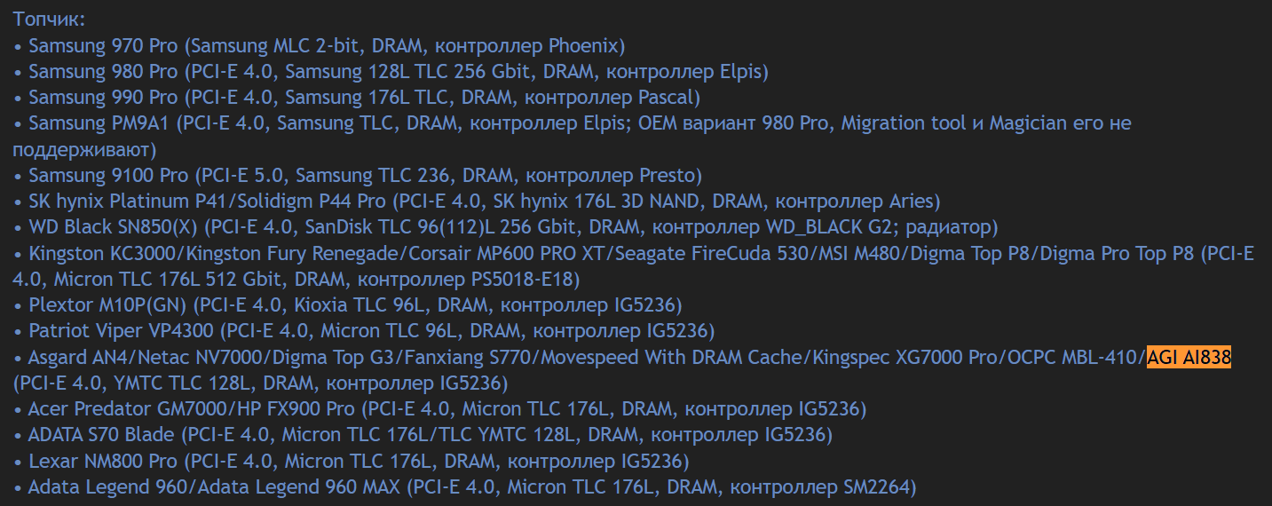 Топчик: • Samsung 970 Pro (Samsung MLC 2-bit, DRAM, контроллер Phoenix) • Samsung 980 Pro (PCI-E 4.0, Samsung 128L TLC 256 Gbit, DRAM, контроллер Elpis) • Samsung 990 Pro (PCI-E 4.0, Samsung 176L TLC, DRAM, контроллер Pascal) • Samsung PM9A1 (PCI-E 4.0, Samsung TLC, DRAM, контроллер Elpis; OEM вариант 980 Pro, Migration tool и Magician его не поддерживают) • Samsung 9100 Pro (PCI-E 5.0, Samsung TLC 236, DRAM, контроллер Presto) • SK hynix Platinum P41/Solidigm P44 Pro (PCI-E 4.0, SK hynix 176L 3D NAND, DRAM, контроллер Aries) • WD Black SN850(X) (PCI-E 4.0, SanDisk TLC 96(112)L 256 Gbit, DRAM, контроллер WD_BLACK G2; радиатор) • Kingston KC3000/Kingston Fury Renegade/Corsair MP600 PRO XT/Seagate FireCuda 530/MSI M480/Digma Top P8/Digma Pro Top P8 (PCI-E 4.0, Micron TLC 176L 512 Gbit, DRAM, контроллер PS5018-E18) • Plextor M10P(GN) (PCI-E 4.0, Kioxia TLC 96L, DRAM, контроллер IG5236) • Patriot Viper VP4300 (PCI-E 4.0, Micron TLC 96L, DRAM, контроллер IG5236) • Asgard AN4/Netac NV7000/Digma Top G3/Fanxiang S770/Movespeed With DRAM Cache/Kingspec XG7000 Pro/OCPC MBL-410/AGI AI838 (PCI-E 4.0, YMTC TLC 128L, DRAM, контроллер IG5236) • Acer Predator GM7000/HP FX900 Pro (PCI-E 4.0, Micron TLC 176L, DRAM, контроллер IG5236) • ADATA S70 Blade (PCI-E 4.0, Micron TLC 176L/TLC YMTC 128L, DRAM, контроллер IG5236) • Lexar NM800 Pro (PCI-E 4.0, Micron TLC 176L, DRAM, контроллер IG5236) • Adata Legend 960/Adata Legend 960 MAX (PCI-E 4.0, Micron TLC 176L, DRAM, контроллер SM2264)