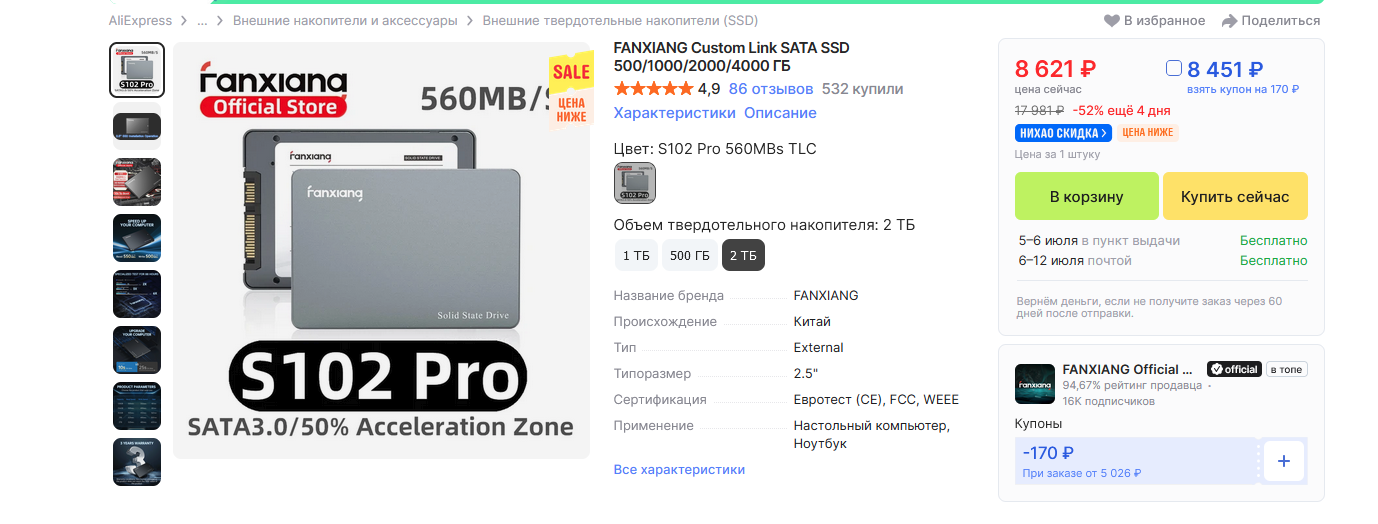 1) Не бери на 120 GB и меньше - низкая скорость из-за малого количества каналов NAND, малый ресурс из-за частой перезаписи ячеек, хороших моделей в этом объёме почти нет 2) Не бери безбуферные/HMB модели под систему 3) Не бери дешёвые китайские и тайваньские диски с заявленными хорошими контроллерами, скорее всего там обман и будет стоять дешман (например, SM2258XT вместо указанного SM2258). Хороший контроллер недёшев, ориентируйся по ценам конкурентов 4) Начался перевод комплектации даже брендовых безбуферных SATA SSD на микросхемы NAND-памяти типа QLC без изменения наименования моделей. Отныне SATA SSD без DRAM являются не рекомендованными к покупке 5) Не рекомендуются устройства на на контроллере PS3111-S11, т.к. при некоторых проблемах, например, с питанием, они могут уходить в защиту. После чего восстановление работоспособности диска возможно, а данных - нет