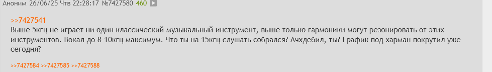 >>7417971 >Субъективного там самый минимум, особенно у колонок, где элемент утечки баса одинаковый Да вполне кривой вытянутый саб заметен, можешь не коупить. Проще его не вытягивать или слушать максимально тихо. Вообще изначальную тему, что полноразмеры>затычки оно затрагивает чуть менее, чем никак. Да, в некоторых полноразмерах саб к бюджету вытянуть без всратого КНИ проще, хотя с мониторами в подготовленной комнате оно не сравнится. >Экв с этим никак не поможет Skill issue. Эквишь ты один раз под одну посадку, усредняя все перепады, которые от неё зависят, которые минимальны на фоне гейна, и сглаживая гейн ВЧ, который поднимает всю грязь сведения и твоих пиков от смены посадки. Потом смена посадки не заметна, если модель не настолько неудачная, как FT1. Коупишь в IEM ты, я сижу только в полноразмерах, если ситуация позволяет, по причинам, которые я тебе неоднократно изложил. Есть целая категория вполне здравомыслящих аудиоэнтузиастов, которые предпочитает полноразмеры IEM, даже с учётом сложности эквализации. >Поэтому тот же оратори делает усреднение и дико сглаживает графики полноразмеров Это проблема утечек, посадки и формы конкретного стенда. Резонансы конкретной закрытой ракушки с конкретным экземпляром наушников очень индивидуальны, поэтому выше 2-3 кГц на график замеров АЧХ полноразмеров стоит смотреть с большим упрощением. Да и разброс АЧХ от смены посадки от полноразмеров к полноразмерам разный. Повторяю вопрос: что ты там конкретно с таким большим разбросом от смены посадки наэквился, что тебя заставило полноразмеры списать для каллекций? IEM на фоне полноразмеров это разноцветные камушки, которые под эквом звучат одинаково, и кроме как для каллекций ни на что не годные. >Ты все то же самое можешь услышать и на полноразмерах, если они играют полный диапазон Одна из важных составляющих пространственных эффектов помимо общей схожести АЧХ к in-room response на барабанной перепонке это тактильность басов, которой нет в IEM, которую ты почему-то упорно игнорируешь в полноразмерах.