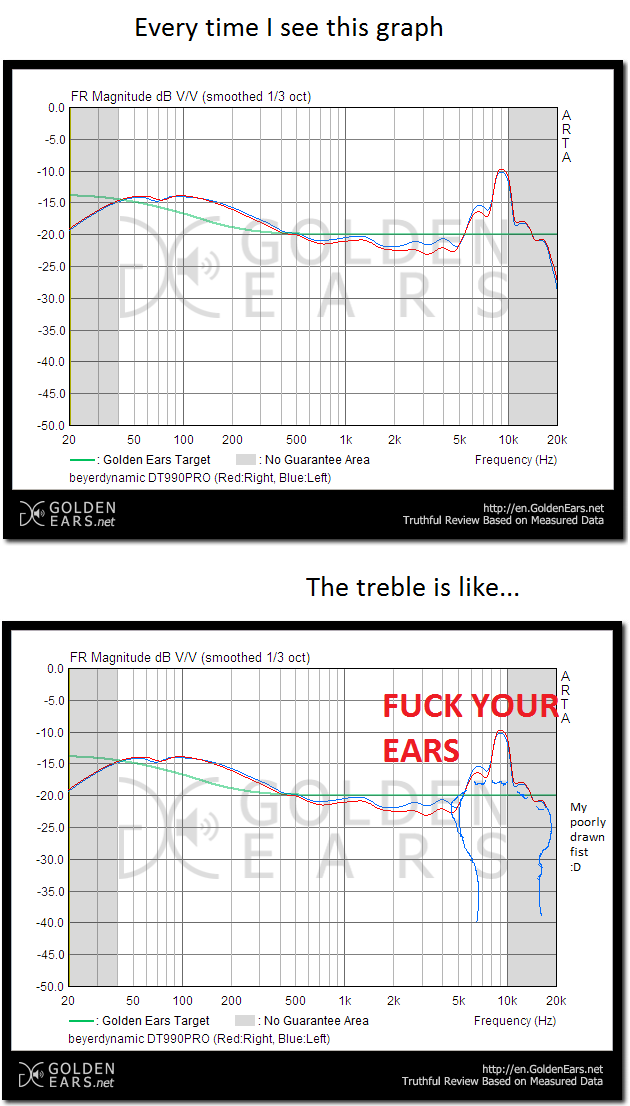 Тащемта, я-то гейны на ВЧ в полноразмерах подебил. У них всех довольно узнаваемый схожий паттерн, как и у IEM'ов. Щас мне уже абсолютно похуй на АЧХ полноразмеров. Главное чтобы сильно всратая не была с сильным разбросом, зависимостью от посадки и высоким THD басов.