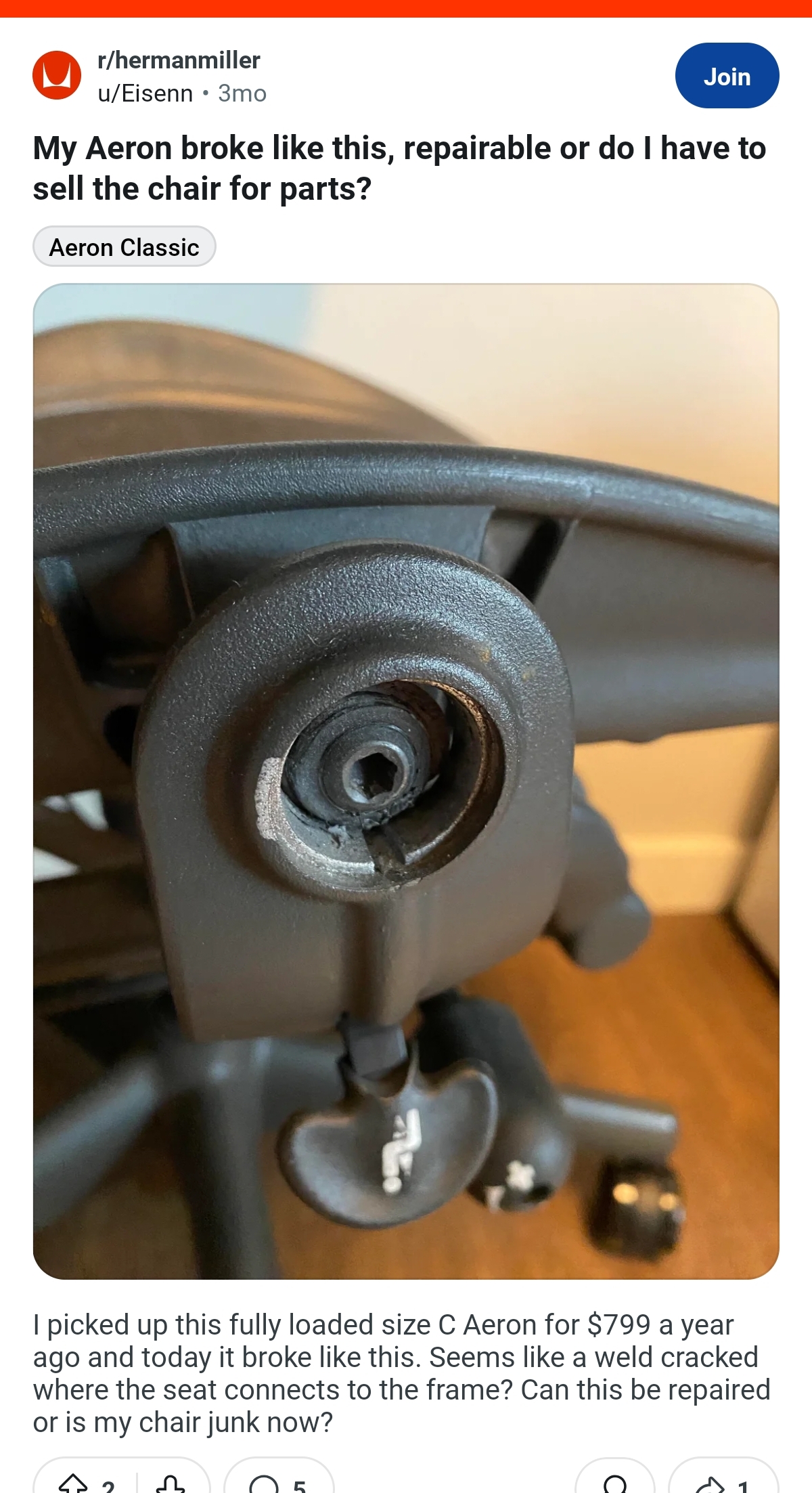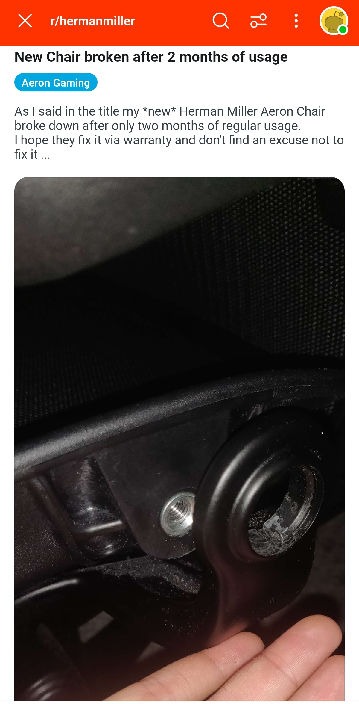 >>7457233 > Меняется сиденье в сборе. По гарантии Без гарантии — меняется болт, который часто тоже бу из других столетних кресел Дохуя у тебя гарантии в СНГ? А запчастей дохуя?