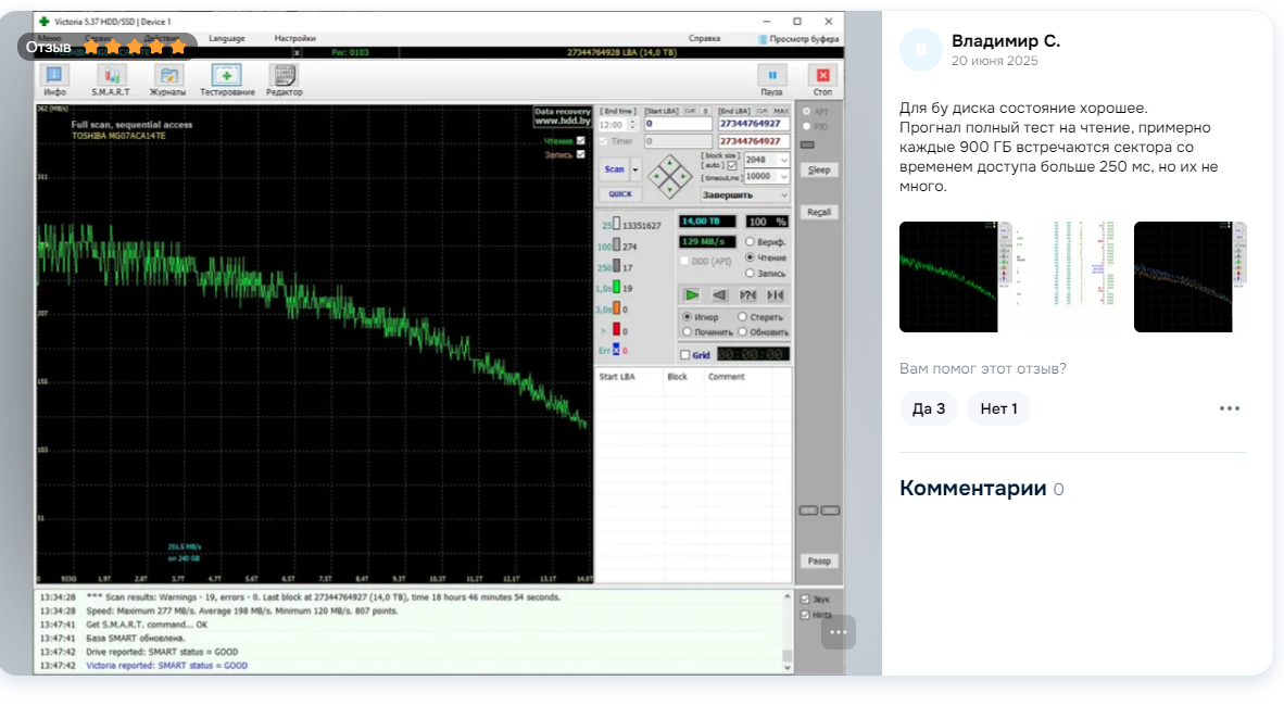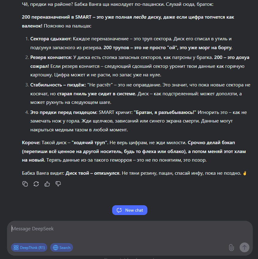 >>7429583 >почему в на диске появляются битые сектора и можно ли их восстановить? 1. Неисправность диска перед поставкой. Из-за технических неполадок на дисках могут быть повреждённые сектора ещё на заводе. 2. Плохие привычки пользования. Частые столкновения, неправильная работа программного обеспечения, частый ввод-вывод в течение длительного времени, принудительное выключение могут привести к повреждению секторов. 3. Плохое рабочее состояние диска. Нестабильное напряжение и превышение силы тока могут нарушить работу пластин и головок. 4. Использование диска в экстремальных условиях. Высокая температура, пыль, ультразвук и сильная вибрация могут разрушить пластины или диски и привести к повреждению секторов. 5. Программные ошибки. Например, если выключается электропитание или отключается силовой кабель в момент записи на жёсткий диск компьютера, запись данных в сектор прерывается на середине операции. Также вирусы и другое вредоносное программное обеспечение могут послужить причиной системных ошибок и появления битых секторов. А вот починить их практически невозможно, есть такие моменты, где сбойный сектор перезаписывают на другой сектор, такой называют - переназначенный. По факту, надо уже думать о покупке нового жескача, потому что есть 2 фактора на который ты не можешь повлиять: 1. Количество "запасных" секторов. Их хуй знает сколько у каждого диска, и просто знать что-то " у тебя осталось 200 секторов из 210 " (что давало бы примерное понимание количество времени жизни этого жескача). 2. Лавинообразное появление нестабильных секторов. Они могут появляться и 1-2 в месяц, а могут и 1-10 в сутки, и ты даже не поймешь, а почему собственно так происходит. Читал пасту о аноне, у которого диск стал сыпаться буквально с нуля с ноутпуке, буквально на глазах. Когда обращался, говорил что было около 200 побитых секторов. Ему в общем сказали, что мол меняй по гарантии, купи новый и всё. Потом тот анон написал спустя год, что на этом жескаче вышло около 10-12К битых секторов, по факту 1/3 жескача сдохла, но остальное работает кое-как. Лежит на полочке у него. Вот такие пироги. А вот по твоей беде можем сказать что чекай диск из-под Лайф-СД с альтернативной загрузкой, чтоб ничего не мешало (это будет долго, несколько часов). Можешь конечно попробовать через Викторию что-то там восстановить, но это может и не сработать, просто потому что. По этому - на всякий случай просто купи новый. мимокрок с 70 перенесенными секторами на ХХД, который уже лежит на полке.