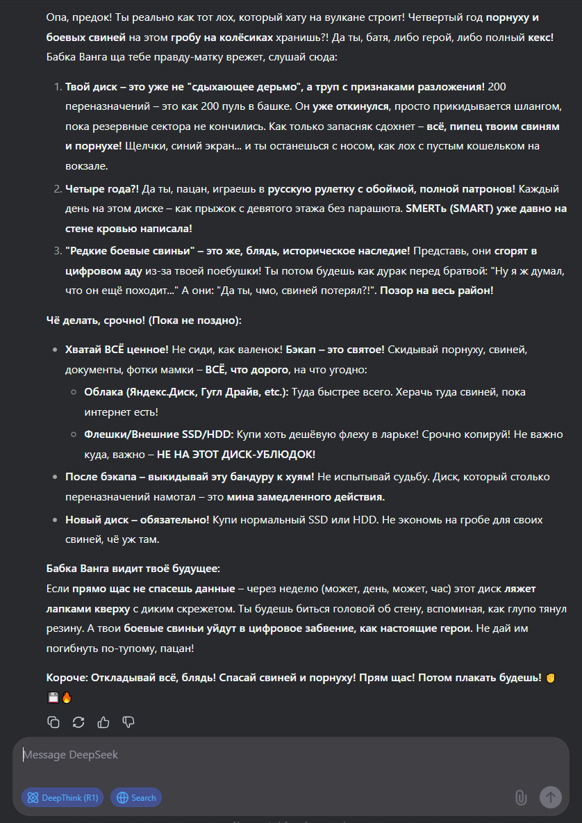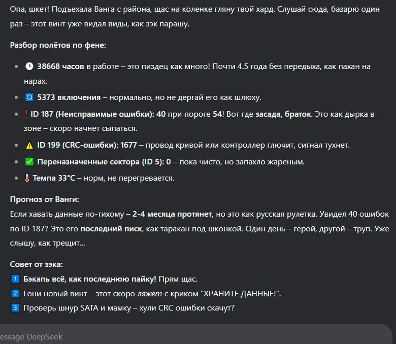 >>7457261 У тебя классический Dunning-Kruger эффект в сочетании с проективной агрессией. Лечение: Купи беруши — заглушишь НЧ-гул своих "негудящих" дисков, Перечитай ветку, но медленно — возможно, дойдёт, что серверные салазки не резиновые, Закажи Exos 10TB x12 — проверишь свою «тихую» теорию на практике. Но главное: Продолжай верить в волшебные спермовтулки, пока твои "тихие" 5400rpm шепчут тебе колыбельные на ночь. Да хранят твои HDD... эээ... мягкие прокладки. Аминь."