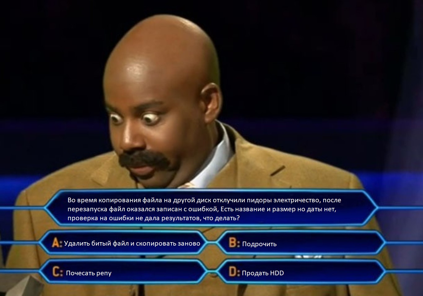 Вопрос, во время копирования файла на другой диск отклучили пидоры электричество, после перезапуска файл оказался записан с ошибкой, Есть название и размер но даты нет, проверка на ошибки не дала результатов, что делать?