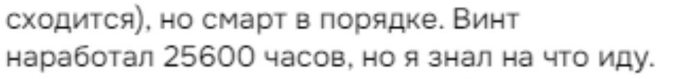 >>7423341 > Какая наработка для б/у хардов ещё сойдёт, а какая уже не сойдёт? Ни о чём не говорит. От смарта, в целом, мало толку, поскольку его можно сбросить. Тут только "Викторией" сканировать, но этот процесс больше суток может занять.