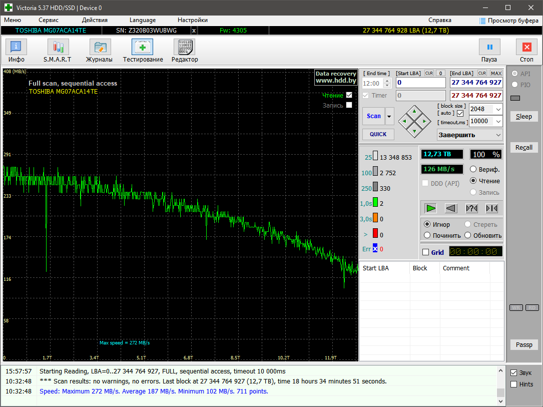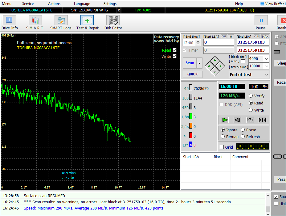 >>7430216 >hdd regenerator И как ты представляешь? "HDD Regenerator — программа для восстановления физически повреждённых жёстких дисков. Она не скрывает повреждённые сектора, а восстанавливает их, не затрагивая существующие данные" И типа как фиксики блядь будут чинить тебе поломанные ФИЗИЧЕСКИ сектора? По факту, это просто берет и переносит с поврежденного сектора данные на новые, неповрежденные. Потому что бывает, что сектор по факту не поврежденный, но к нему очень "долго" записывает, вот и будут его считать поврежденным. Вот я сам лично - через Викторию, начал гонять 6Тб, ушло больше 18 часов, ставил сектора на починку, и всё равно они не исчезали. И вот когда я стал переносить свои файлы на новый, со старого было 4 файла, которые не переносились и выдавали ошибку доступа. Вот и всё. Просто делай так - как появились сектора - ну ничего на диск не записывай и не удаляй. А если ещё со временем их количество увеличивается - ну братан, покупай новый и меняй, тут уже ничего не сделать.