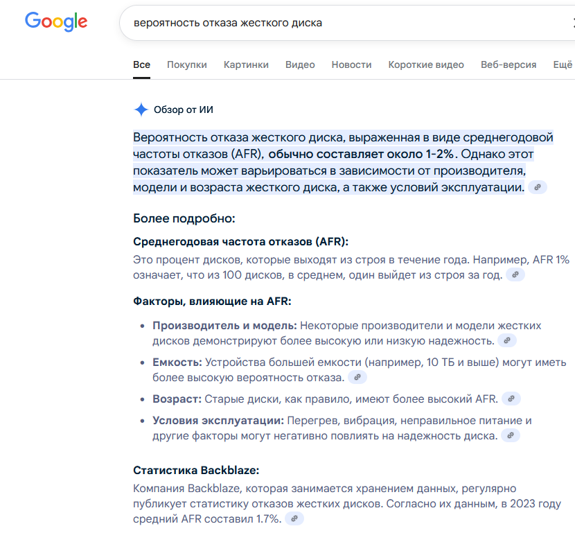 >Вероятность отказа рассчитывается по формуле: >(1-exp(-период/mtbf))х100 >AFR к этому никакого отношения не имеет. Бля, какой ты долбоеб, пиздец просто, высчитывать вероятность отказа по форумел от MTBF. Ну ты хотя бы в гугл бы зашел прежде чем так позорится. Дебилам вроде тебя уже даже на странички заходить не надо, нейросеть все разжует. Но нет, нужно нести хуету брызгая слюной. Дрочь на манямирковые MTBF, полученные из экстраполяции, вместо реального AFR, одновременно путая их друг с другом - это вообще хорошо, таких обсеров давненько в этом треде не было.