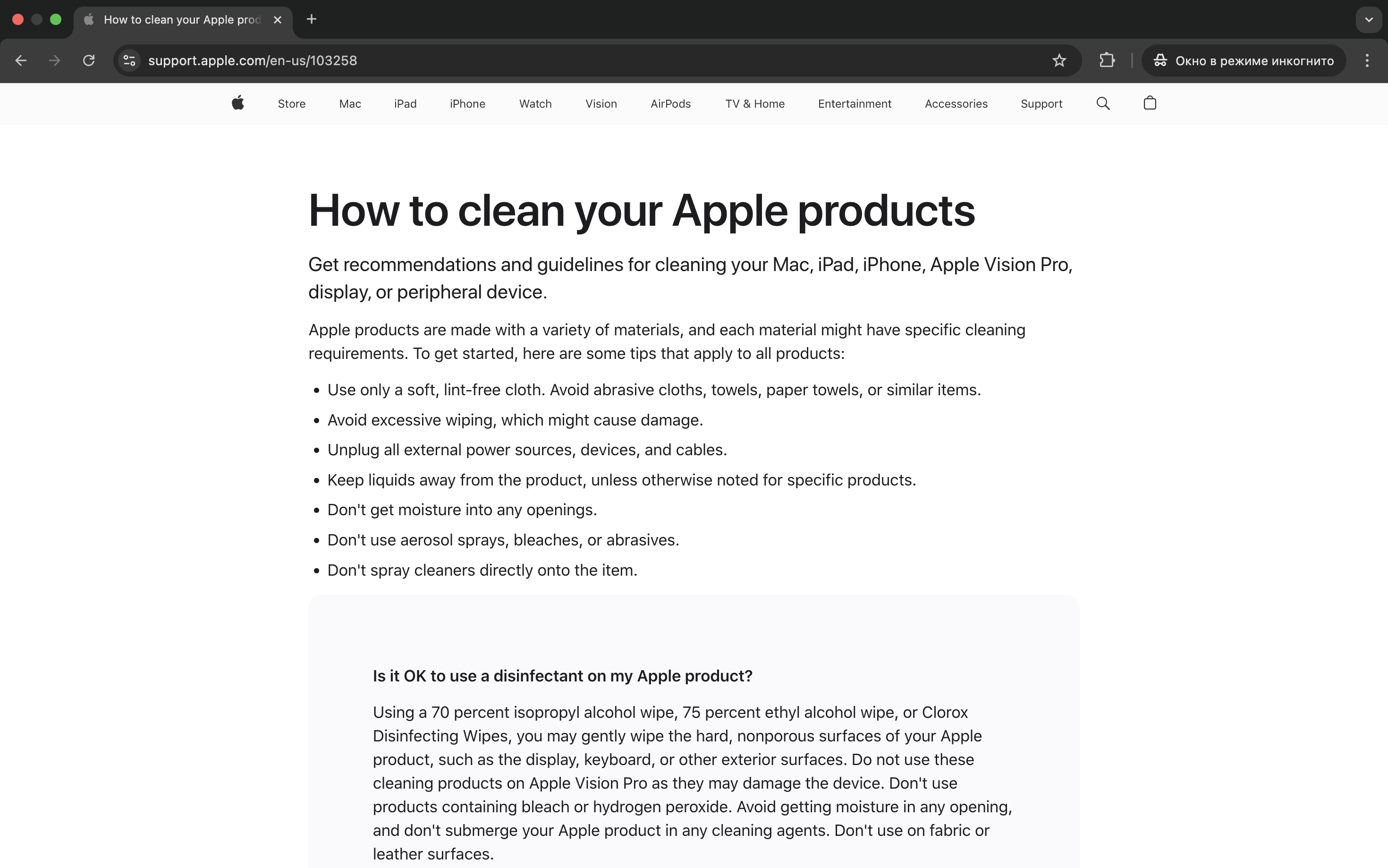 >>7432495 >Сомневаюсь >Using a 70 percent isopropyl alcohol wipe, 75 percent ethyl alcohol wipe, or Clorox Disinfecting Wipes, you may gently wipe the hard, nonporous surfaces of your Apple product, such as the display, keyboard, or other exterior surfaces. Do not use these cleaning products on Apple Vision Pro as they may damage the device. Don't use products containing bleach or hydrogen peroxide. Avoid getting moisture in any opening, and don't submerge your Apple product in any cleaning agents. Don't use on fabric or leather surfaces. Никого не ебёт, что ты там сомневаешься. На том же реддите ёбаная туча постов от бывших работников Apple, подтверждающих это.