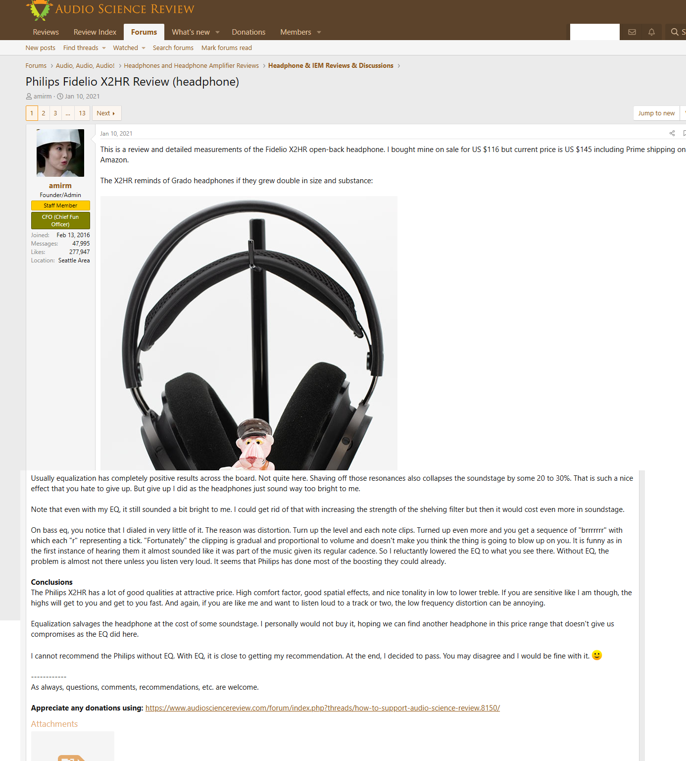 >>7441114 >Те же edition xs Вообще нет уверенности, что у них нет брака с той же частотой. Пробовал их заценить в Доктороголове, и там попался экземпляр с дребезгом одного из каналов на всей частотке. Смысл брать дороже то, что бракует с той же частотой, но стоит в разы дороже, я не вижу. >Зачем он только покупал их аж ещё 2 раза после неудач - вопрос открытый. Низкий THD на инфразвуке >> всё остальное в звуке. Просто башка вибрирует в тон ВЧ и это подкупает. У меня все полноразмеры под эквом звучат приблизительно одинаково с убиранием 20-30 дБ на ВЧ, но буквально из-за басов мне заходят HE400se больше, чем все остальные динамы в каллекции. По мне так остальное больше не нужно. Это отгадка, почему всякие Audeze LCD-2 с казалось бы заваленными ВЧ и подоткнутыми НЧ так заходят некоторым мсье. Полагаю, что с HE-1 или DCA Stealth та же история. То, что драйвера у HE400se от каждого раза через пару месяцев усиливали дребезг, это, конечно, печально.