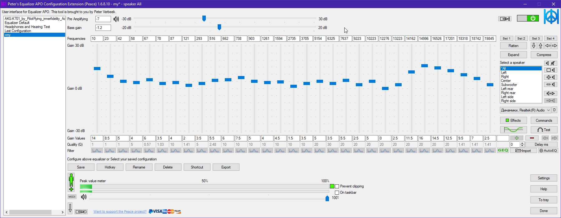 Чего у меня PeaceAPO может не применять эквализацию к наушникам. Файл с эквализацией с сквиглинка я в него закинул, на все девайсы APO установил, нужный девайс из списка выбрал. Но когда запускаю REW что-бы замеры сделать, он мне выдаёт дефолтное АЧХ без эквализации.