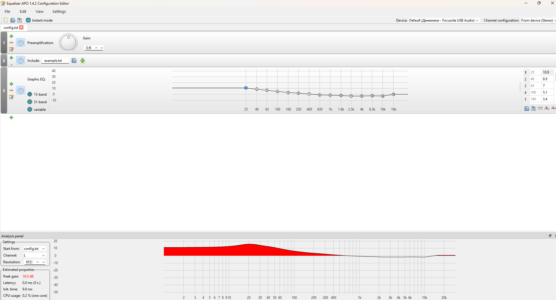 >>7457774 Ничего от добавления лишней громкости определённым частотам аппаратно не ломается, только программно. Чтобы этого не происходило, в первую очередь, в APO не должно быть красной области. Добавь фильтр Preamp в -16 дБ, иначе будет клиппинг басов. Попросту все частоты выше определённой громкости, отмеченной в эквалайзере как 0, срезаются, и на таких частотах появляется треск. Басы лучше добавлять с использованием AutoEQ на squig.link по нейтральному таргету от конкретных наушников, а потом подбирать под себя.