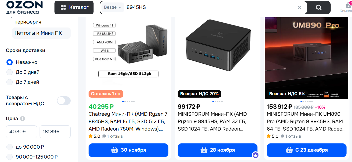 а 7840hs ты за 25 не купишь, там 20 за миник, 6-7 за ddr5 (нужно 2*16 гб иначе у тебя перфоманс пополам), и nvme диск еще 5-7. Поэтому 30-35 это примерно готовый к работе.