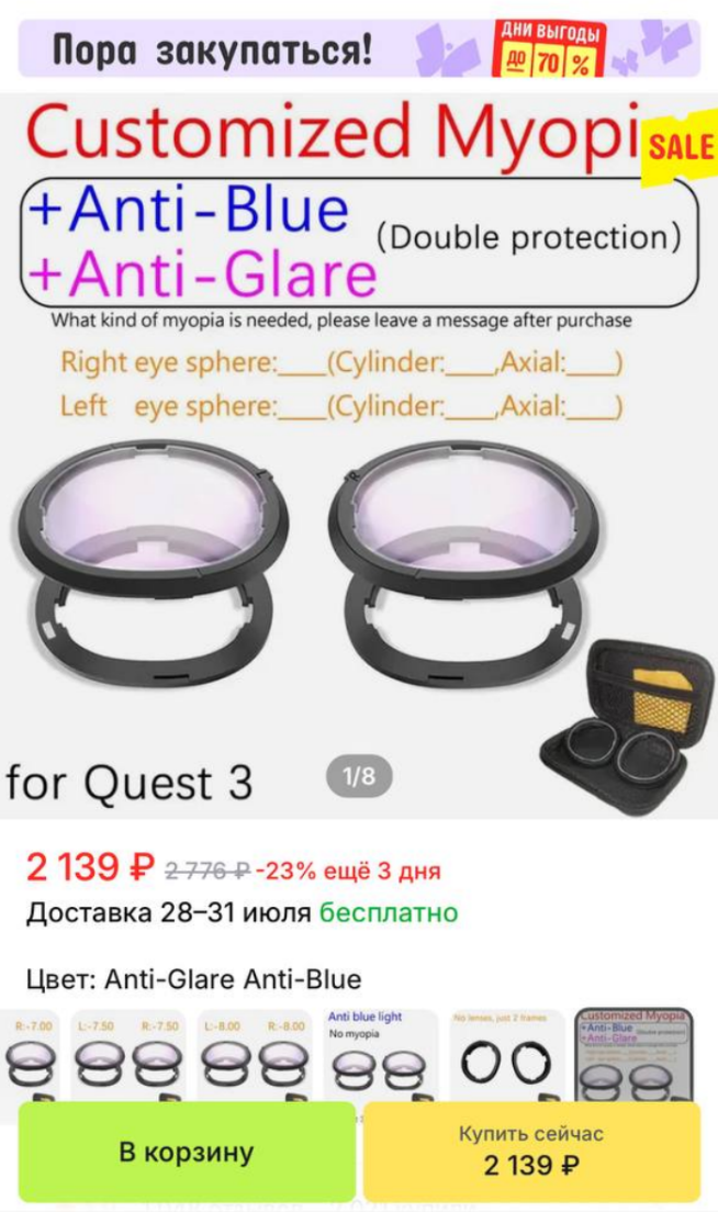 >>7455378 Вот как раз выше написал. Шлем предусматривает играние в очках, но это неудобно. Лучше заказать спец линзы под твое зрение. На алике их как грязи за пару тыщь рублей. Как к вам возит алик я хз, может другие маркетплейсы возят.