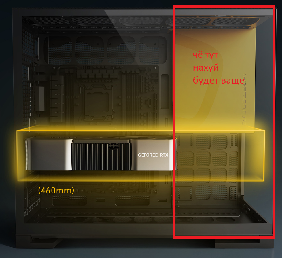 >>7447735 >на картинке У меня подобный корпус стоит, место есть предосточно для воздуха, чтобы часть ушла в карту, а другая часть между крышкой и картой прошла