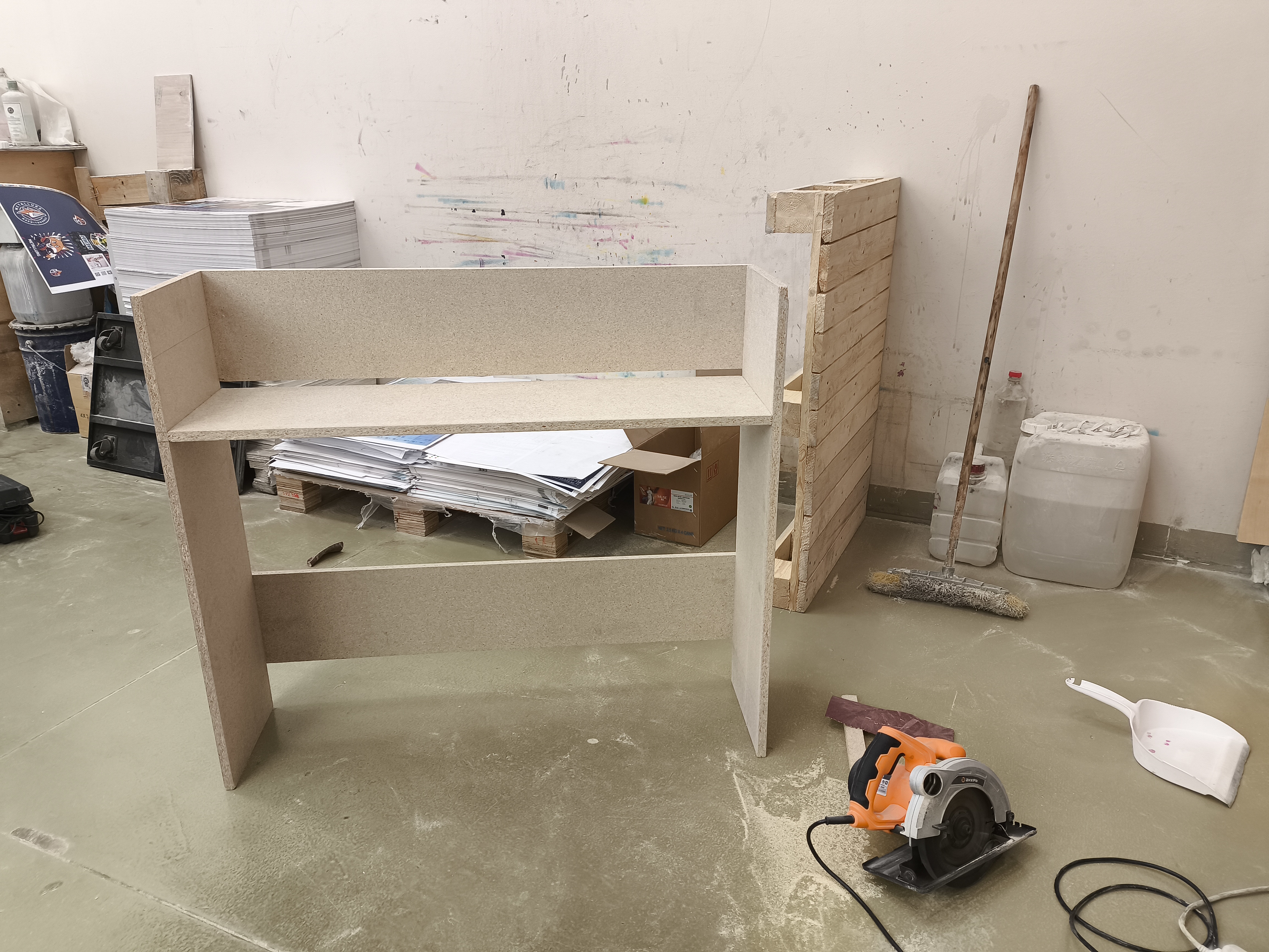 >>7446941 Не уверен правильно что понял вопрос, но да, тупо поделие из дсп. К нам в типографию бумага приезжает в палетах, и сверху проложена дсп, соответственно этих дсп на халяву жопой жуй. Прям там и распилил и сркутил на самые что ни на есть ебаные чёрные саморезы и задул с баллона. Даже странно что так симпатично получилось.
