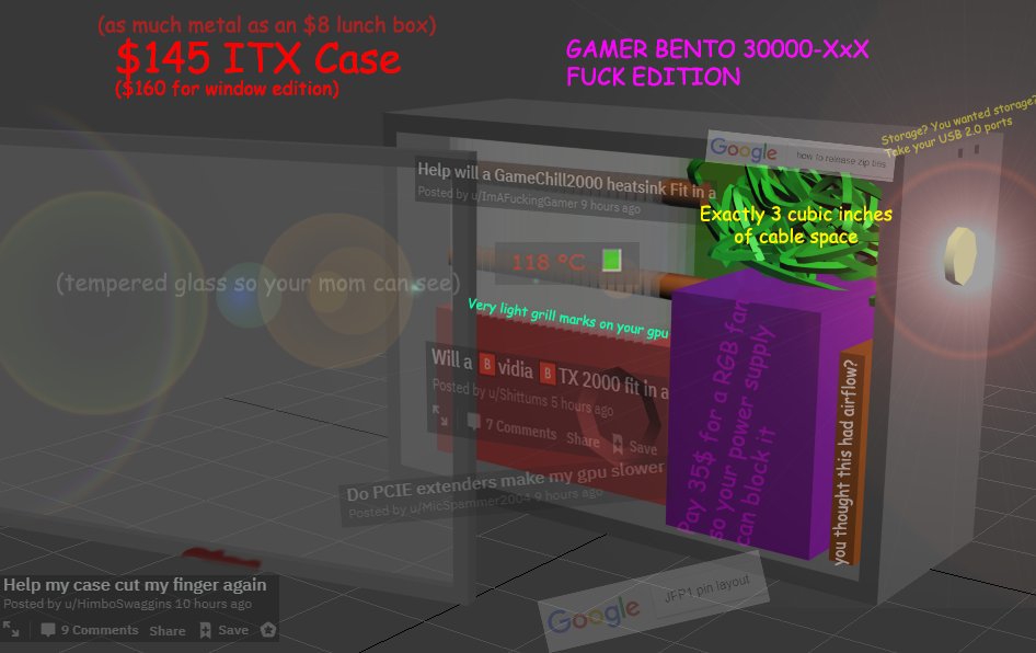 >>7445485 говно аквариумоидное неудобное непрактичное. ну вот что по-твоему про него ещё можно сказать? не покупайте подобную парашу, берите нормальные корпуса, пусть хоть с стеклом, но одним сбоку, не берите огромные эти стеклянные душевые кабинки, за которые взяться нормально нельзя. стёкла на клипсах этих ебучих хлипких тупо ред флаг, куча проёбанного места. типа вот какой игровой монстр и в каком году там будет стоять 46см в длину? возможность добавить подставку для любимого соевого говна в плюсах корпуса