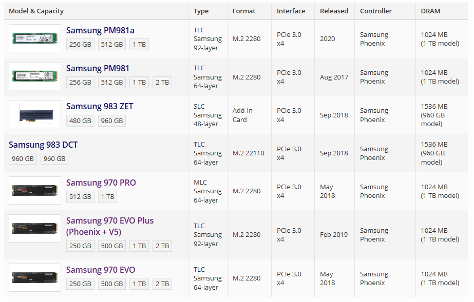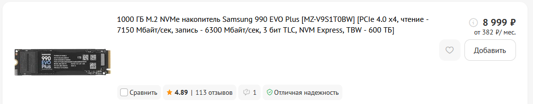 Топчик: • Samsung 9100 Pro (PCI-E 5.0, Samsung TLC 236, DRAM, контроллер Presto) • A-Data Legend 970 Pro (PCI-E 5.0, Micron 232L TLC NAND, контроллер Innogrit IG5666) • Crucial T705 (PCI-E 5.0, Micron 232L TLC NAND, контроллер Phison PS5026-E26) • MSI Spatium M570 Pro Frozr (PCI-E 5.0, Micron 232L TLC NAND, контроллер Phison PS5026-E26, из особенностей - огромный радиатор) • Samsung 970 Pro (Samsung MLC 2-bit, DRAM, контроллер Phoenix) • Samsung 980 Pro (PCI-E 4.0, Samsung 128L TLC 256 Gbit, DRAM, контроллер Elpis) • Samsung 990 Pro (PCI-E 4.0, Samsung 176L TLC, DRAM, контроллер Pascal) • Samsung PM9A1 (PCI-E 4.0, Samsung TLC, DRAM, контроллер Elpis; OEM вариант 980 Pro, Migration tool и Magician его не поддерживают) • SK hynix Platinum P41/Solidigm P44 Pro (PCI-E 4.0, SK hynix 176L 3D NAND, DRAM, контроллер Aries) • WD Black SN850(X) (PCI-E 4.0, SanDisk TLC 96(112)L 256 Gbit, DRAM, контроллер WD_BLACK G2; радиатор) • Kingston KC3000/Kingston Fury Renegade/Corsair MP600 PRO XT/Seagate FireCuda 530/MSI M480/Digma Top P8/Digma Pro Top P8 (PCI-E 4.0, Micron TLC 176L 512 Gbit, DRAM, контроллер PS5018-E18) • Patriot Viper VP4300 (PCI-E 4.0, Micron TLC 96L, DRAM, контроллер IG5236) • Asgard AN4/Netac NV7000/Digma Top G3/Fanxiang S770/Movespeed With DRAM Cache/Kingspec XG7000 Pro/OCPC MBL-410/AGI AI838 (PCI-E 4.0, YMTC TLC 128L, DRAM, контроллер IG5236) • Acer Predator GM7000/HP FX900 Pro (PCI-E 4.0, Micron TLC 176L, DRAM, контроллер IG5236) • ADATA S70 Blade (PCI-E 4.0, Micron TLC 176L/TLC YMTC 128L, DRAM, контроллер IG5236) • Lexar NM800 Pro (PCI-E 4.0, Micron TLC 176L, DRAM, контроллер IG5236) • Adata Legend 960/Adata Legend 960 MAX (PCI-E 4.0, Micron TLC 176L, DRAM, контроллер SM2264)